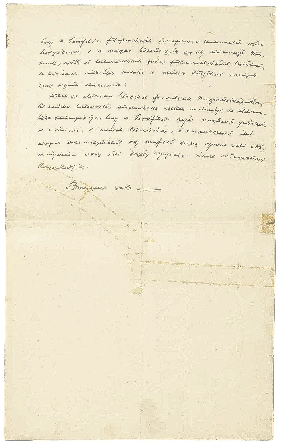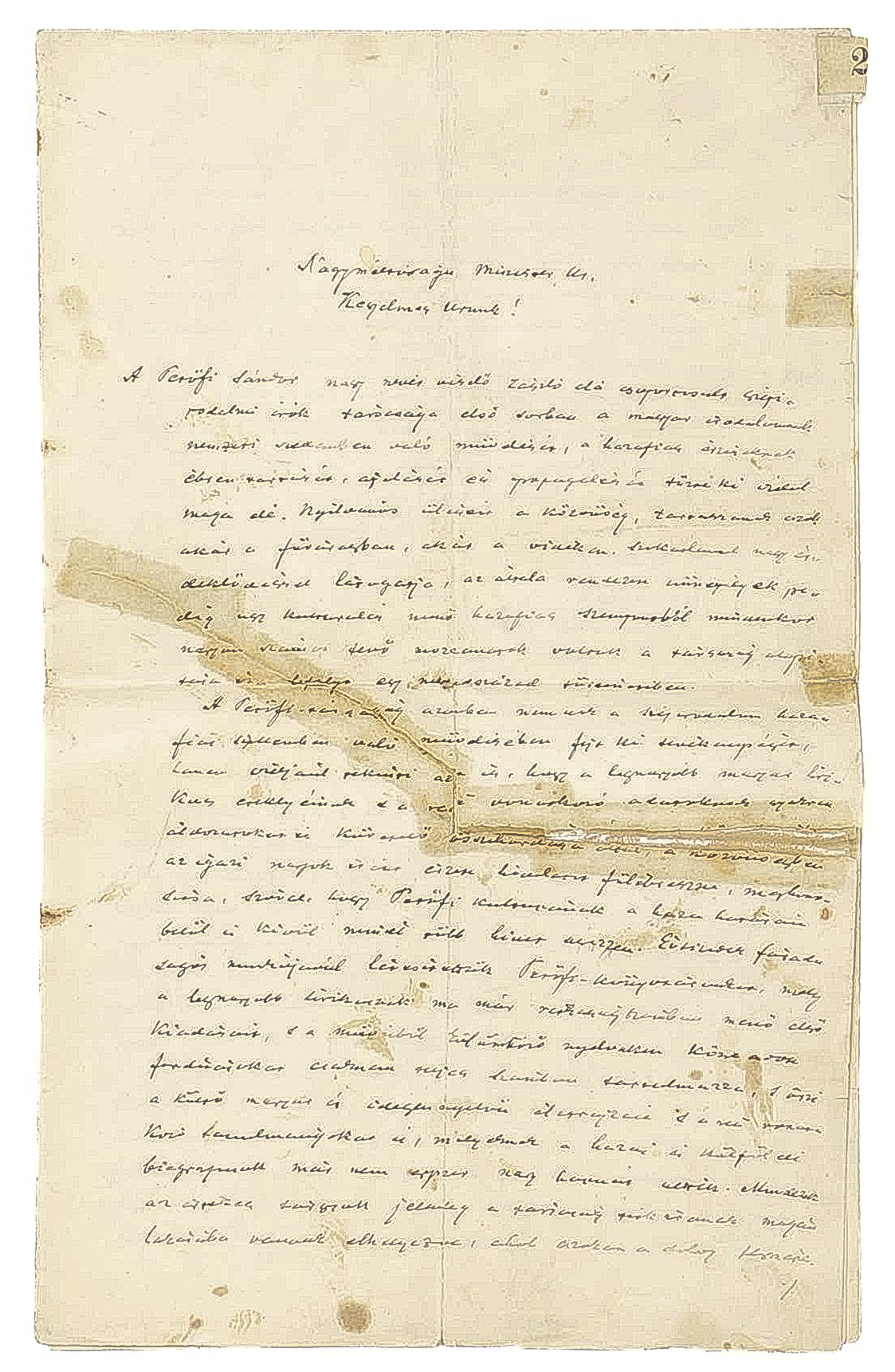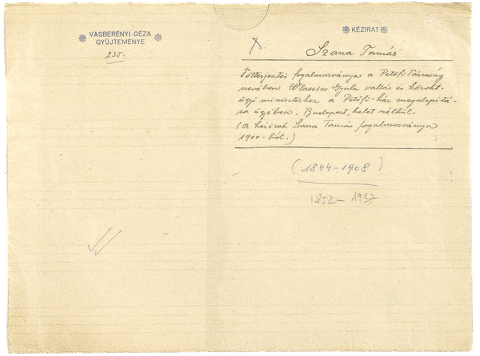 Budapest, ca. 1900 (é.n.)A Petőfi Társaság alapító főtitkára, Szana Tamás (1844-1908) által az akkori vallás- és közoktatásügyi miniszternek, Wlassics Gyulának (1852-1937) írt felterjesztő levél-fogalmazványa a Petőfi-ház létrehozásáról. "Nagyméltóságú Miniszter Úr. Kegyelmes Urunk!" megszólítással. Három tintával beírt oldal. A második levélen Ernst Lajos gyűjteményi pecsétjével (mellette tintával: XIII. 198.). A hozzátartozó borítékon Vasberényi Géza gyűjteményi pecsétje, alatta 235-ös jelzetszám, valamint tintás kézírással a tételről szóló összefoglaló sorok.