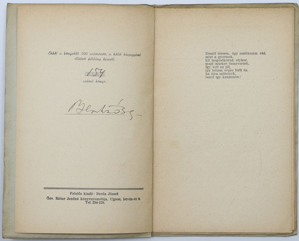 31+[1]p. Első kiadás. Számozott (154/500), aláírt, címlapon dedikált példány! A kötetből egy levelet (21-22. old.) a rajta szereplő erotikus vers miatt az ügyészség utasítására ki kellett vágni.