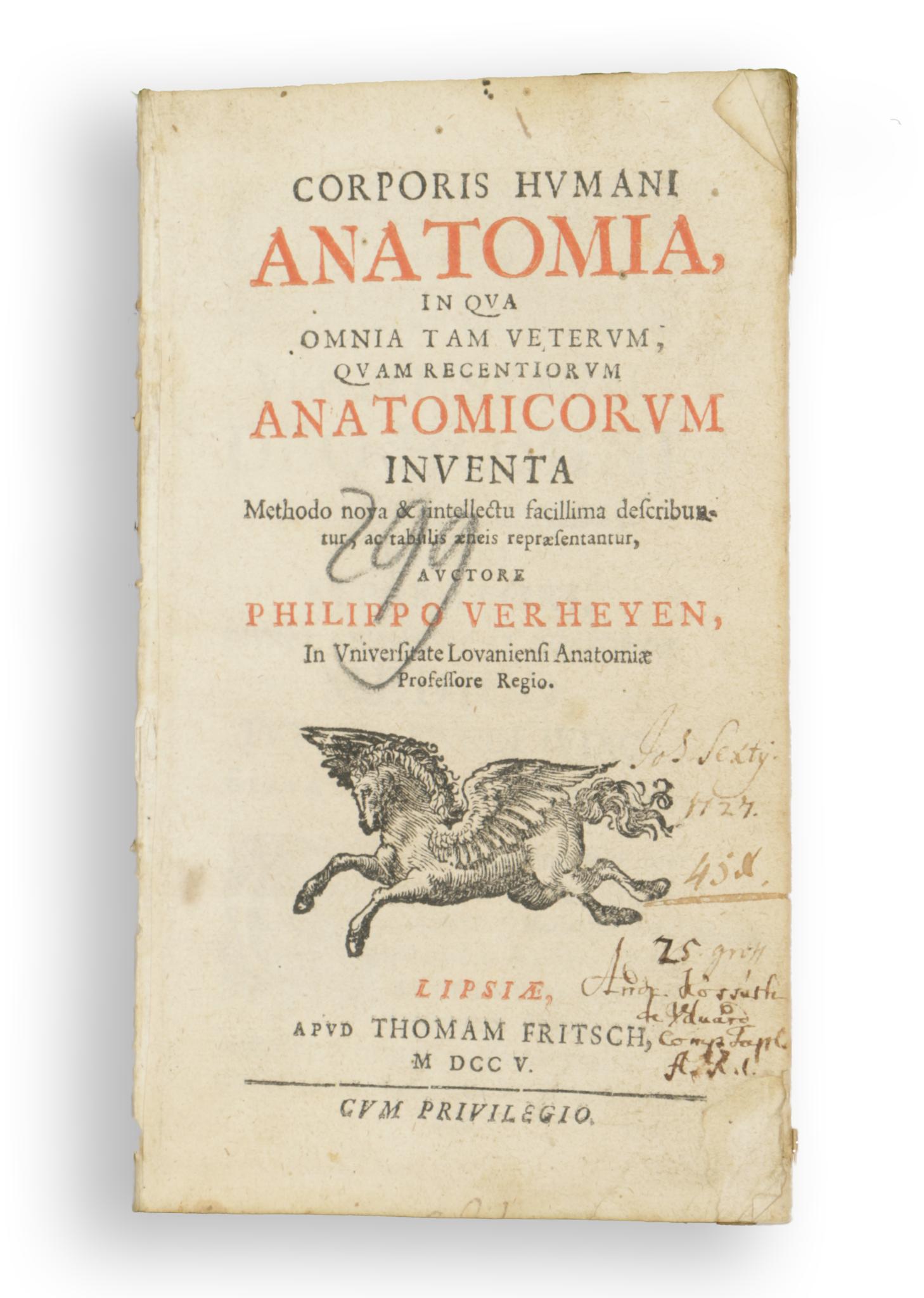 Philip Verheyen (1648-1710) olvasott, független kutató volt, akinek elhivatottságát, nem kevés túlzással örökítette meg festményén 1715-ben egy anonim festő, melyen Verheyen a saját amputált lábát boncolja. Igaz, a leuveni anatómia professzoraként munkakörülményei korántsem voltak tökéletesek: boncolható holttestek ritkák és nehezen beszerezhetők voltak, és nem álltak rendelkezésre boncolásra alkalmas létesítmények sem (az első boncterem csak 1744-ben, jóval az ő halála után épült meg). Leghíresebb művét, az 1693-ban megjelent Corporis humani anatomiae-t huszonyegy alkalommal nyomtatták újra, és számos európai egyetem alkalmazta tankönyvként. Az illusztrációk gyengébb minőségűek voltak (valószínűleg ő maga rajzolta őket), mint az anatómusok számára írt korabeli atlaszokban. Verheyen könyve azonban nemcsak atlasz volt, hanem tömör kézikönyv is, amely bemutatta olvasóinak, hogy az anatómia tanulmányozása szerves része az élettan tanulmányozásának. Kifejezetten diákok számára íródott, és a szerző tervezése szerint megfizethetőnek szánták. Egészen a 18. század közepéig referenciamű maradt. Jelen tétel a mű harmadik kiadása.