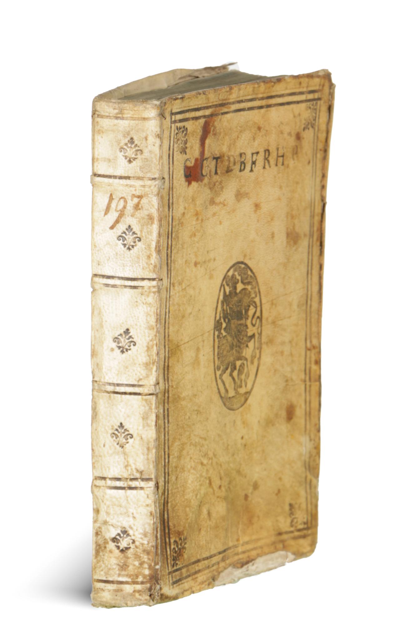 Példányunkat kötése tesz kifejezetten értékesé, ugyanis az a mű dedikáltjának, Thurzó György nándornak a super ex librise. A korabeli papírtáblás egészpergamen-kötést dupla fekete lénia keretezi, belső sarkait stilizált növényi ornamentikájú egyesbélyegzőkkel díszíti, a táblák közepén ovális keretben egy-egy (különböző) lovaskatonát ábrázoló bélyegző lenyomatával, az elülső táblán pedig: "C G T D B F R H P" felirat találhatók, amely a következőképpen oldható fel: " Comes Georgius Thurzo De Betlehem Falwa Regni Hungariae Palatinus".