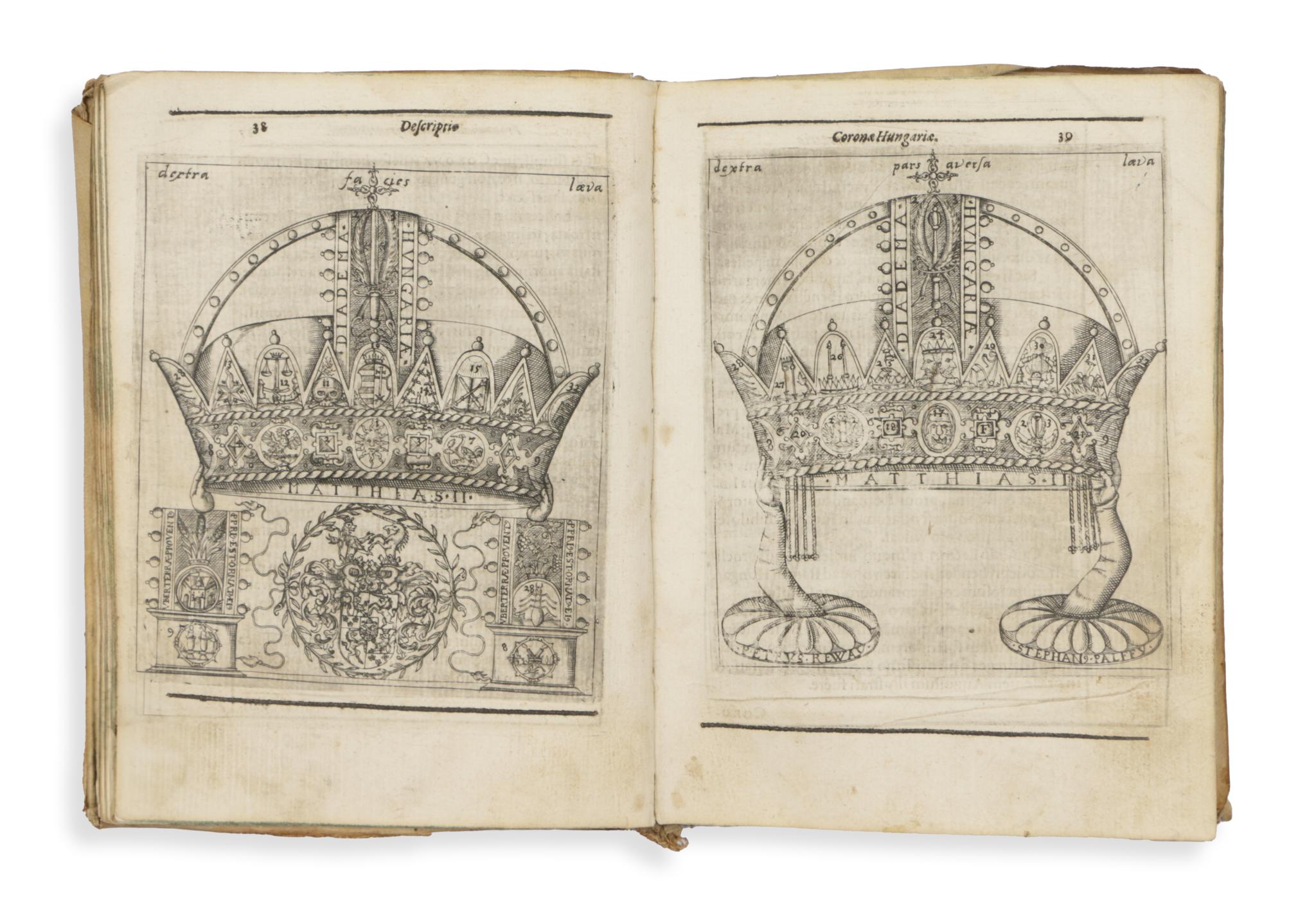 1615 Lavingae Suevorum [Leiden]Typis Palatinis excudebat M. Jacobus Winter. 207p. Lapszámozáson belül három egészoldalas, rézmetszetű illusztráció a magyar koronáról, ebből az első a címképmetszet. Ezenkívül 24 köralakú, rézmetszetű embléma és 8 fametszet is díszíti a művet. Készítőjük feltételezhetően maga a szerző.