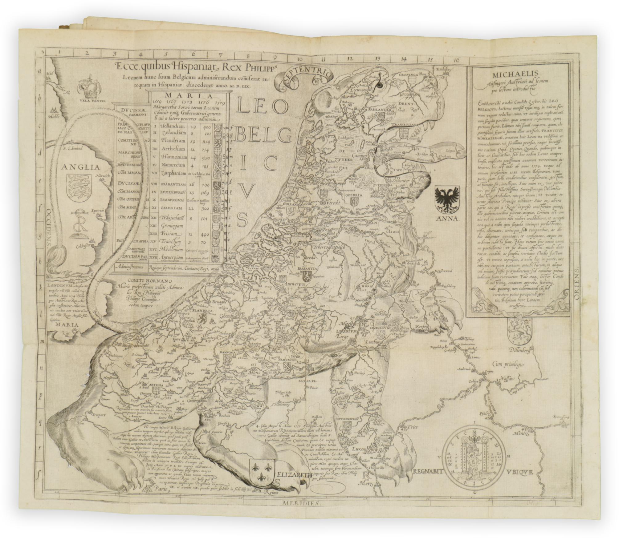 The work gives a numbered list of the seventeen provinces of the then German Lowlands, which was not yet an accepted fact at the time. Aitzing's map and his work may have laid the foundations for the idea of a common confederation of seventeen German Länder. Many copies are missing this important map, which is an essential part of the work in its own right. Aitzing's lion map was extremely influential and was widely imitated by many cartographers in later Dutch histories and atlases. Engraving by Franz Hogenberg, size 47×39cm.