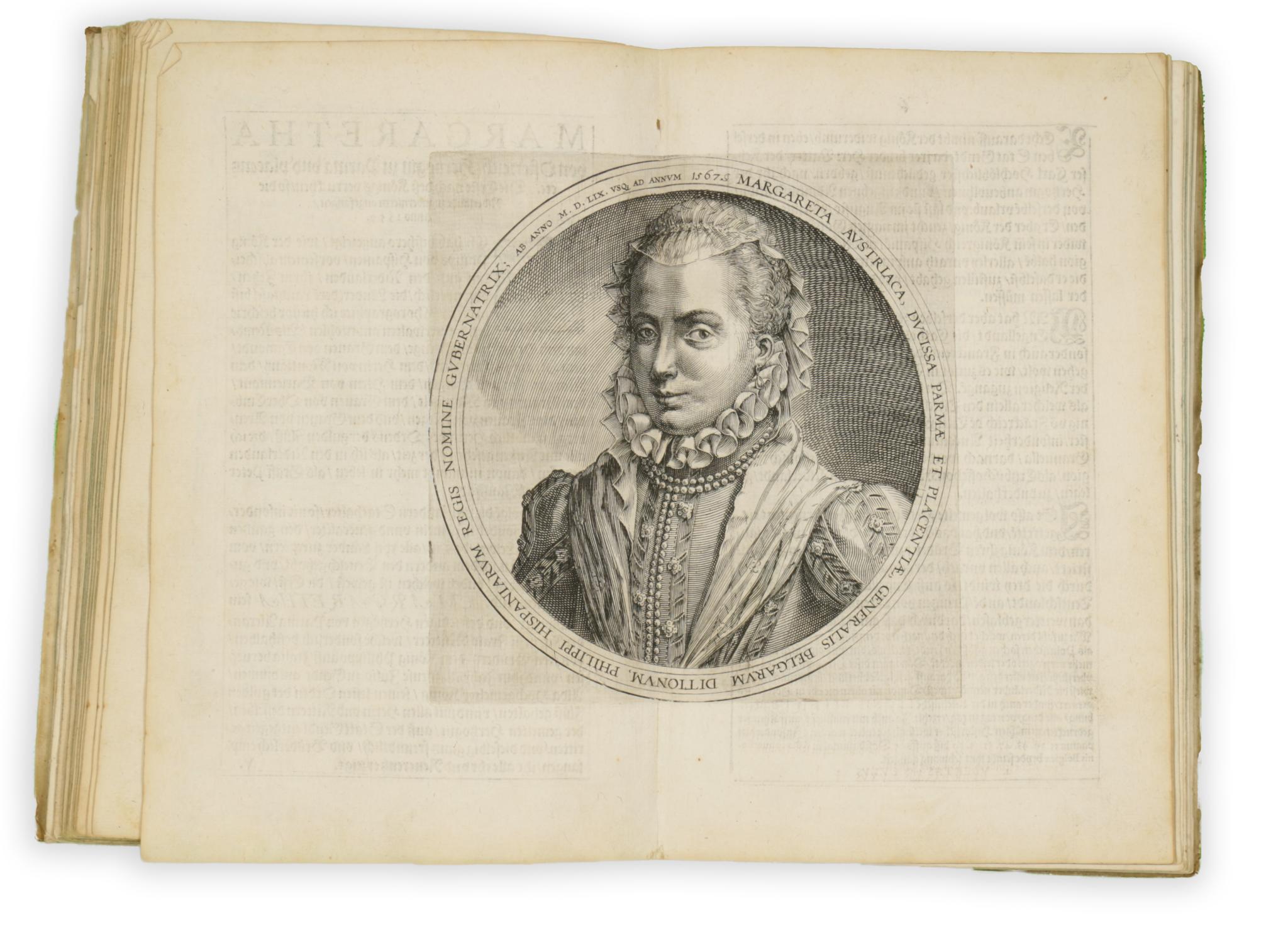 Rézmetszetű díszcímlap + nagyméretű kihajtható metszett Belgium (Leo Belgicus) térkép + 5 kétoldalas metszett portré és 17 számozott kétoldalas metszett térkép. A végén két rézmetszetű portré + 18 üres levél. Mindegyik portré és térkép egy-egy bifolium belső oldalára nyomtatva, a kísérő szöveg a hátoldalon. Fraktúrával nyomtatott, és több gótikus fametszettel díszített iniciáléval.