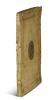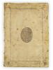 Contemporary sheepskin vellum with straight stitching on four slit straps across the spine, sometime with ribbon binding. The decorated panel has an oval arabesque motif in the centre.