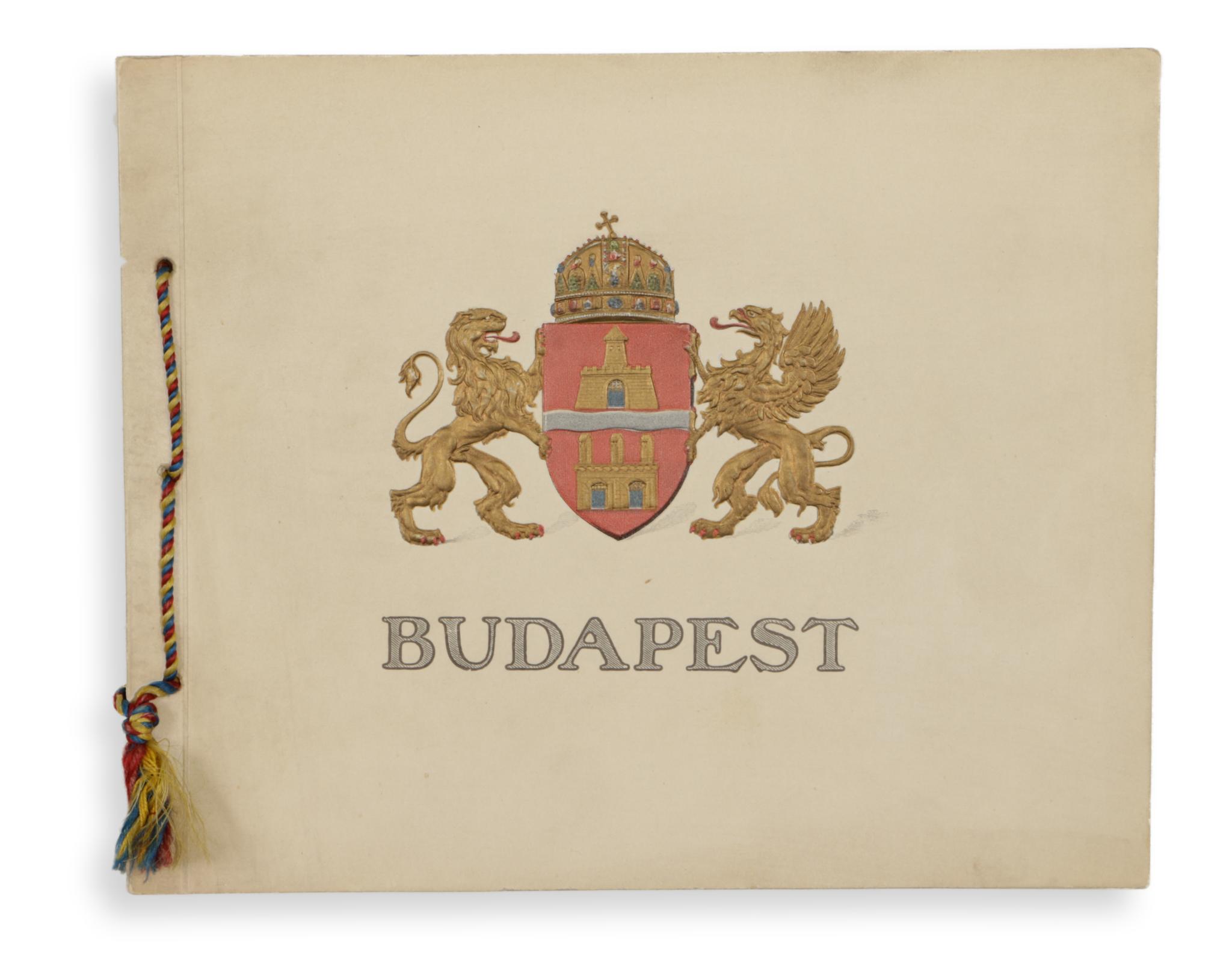 Négynyelvű feliratokkal. Haránt alakú. Zsinórral átfűzött kiadói borítékban, a főváros dombornyomott, aranyozott címerével. - Tiszteletjegy dr. Reiss Mór részére a Thermal Palace Hotel és Irma-fürdő megtekintésére. 1909, Budapest, [Ifj.] Hornyánszky Viktor. Színes, négy oldalas nyomtatvány a hotel és a fürdő leírásával, illusztrált papírborítóban.