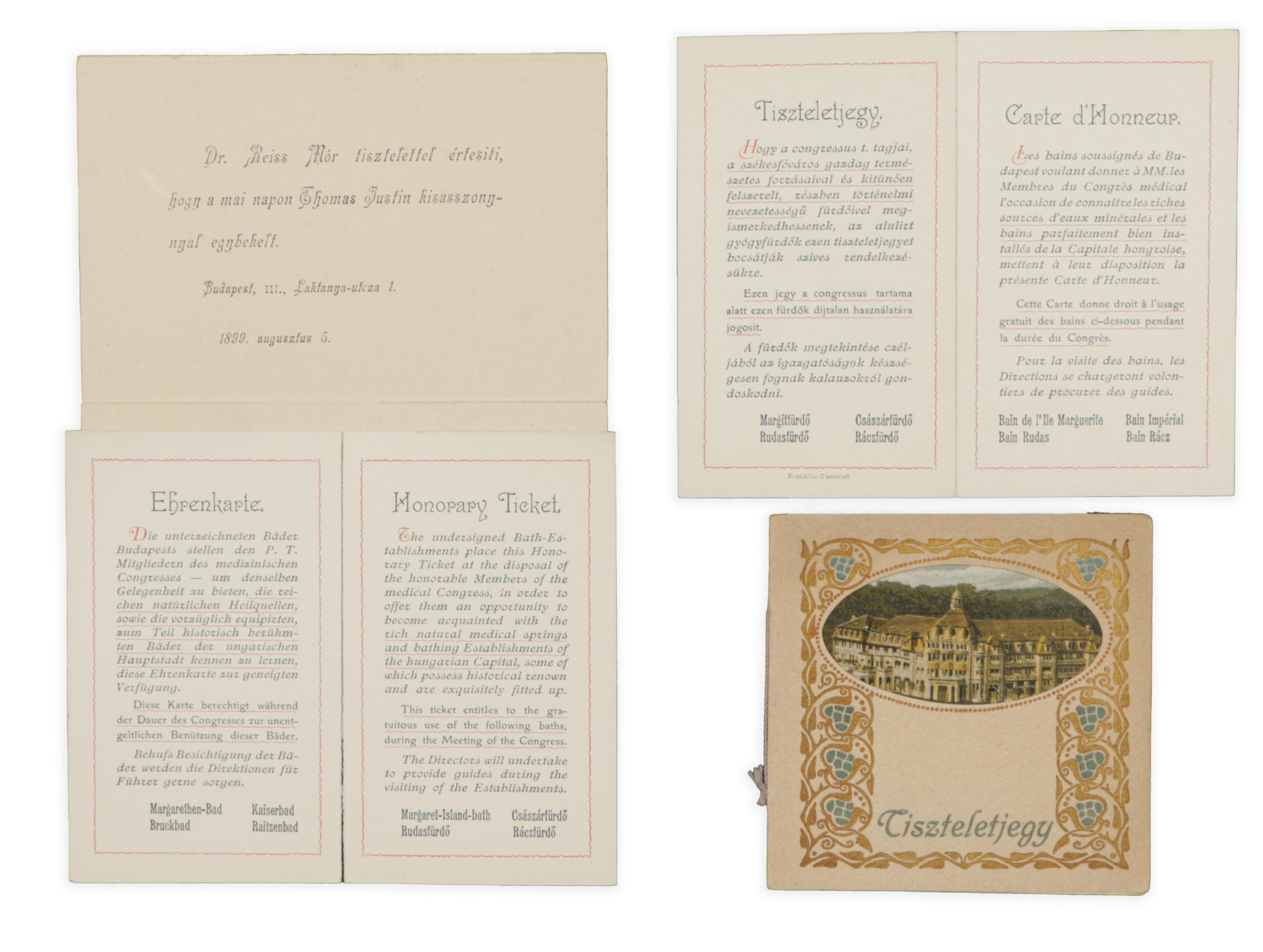 Mérete: 10,2 × 10,2 cm. - Tiszteletjegy a Margitfürdő, Rudasfürdő, Császárfürdő és Ráczfürdő megtekintésére és díjtalan használatára. 1909, Budapest, Franklin-Társulat. Négynyelvű. 2 darab. Mérete: 12,3 × 7,5 cm.