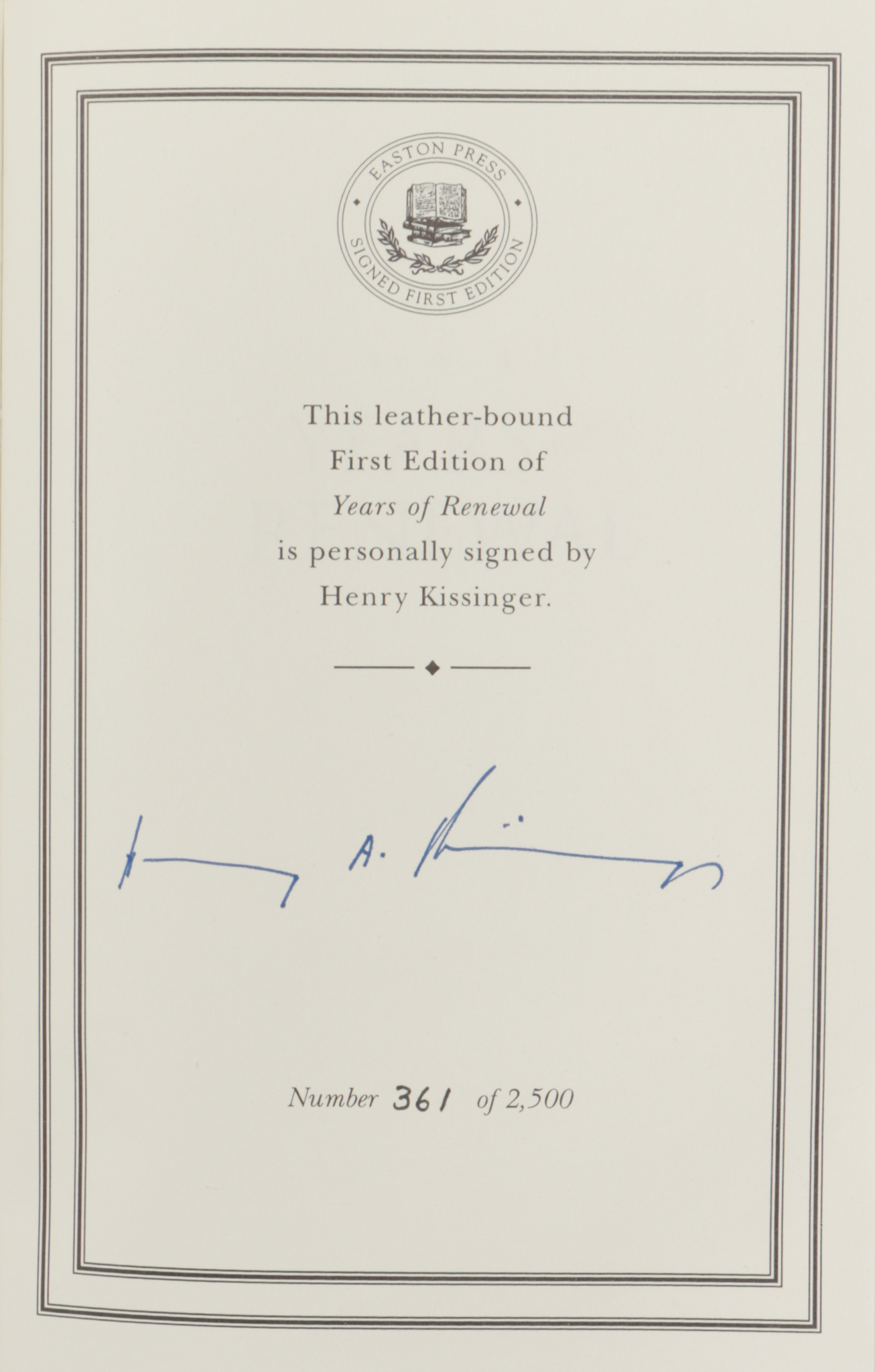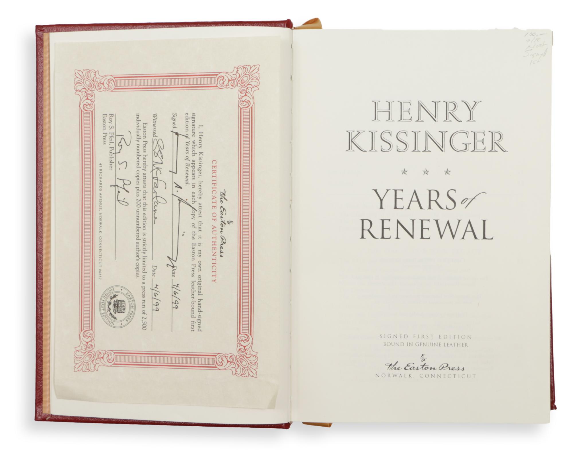 First, limited Edition of 2500 signed and numbered copies. This being No. 361 and signed by the author on the Limitation Page. Includes the original Easton Press Certificate of Authenticity, signed by Henry Kissinger and Roy S. Pfeil Publisher on 4, July, 1999.