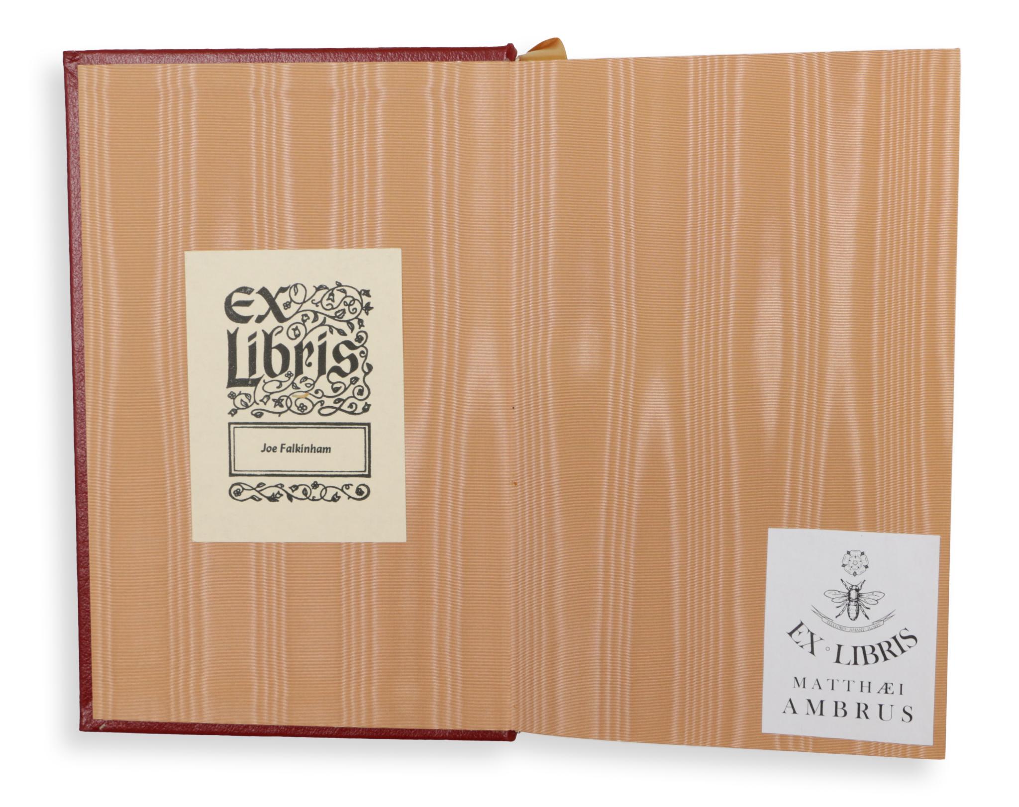 Két ex libris a selyem moiré előzéklapokon: Joe Falkínham és Matthaei Ambrus.