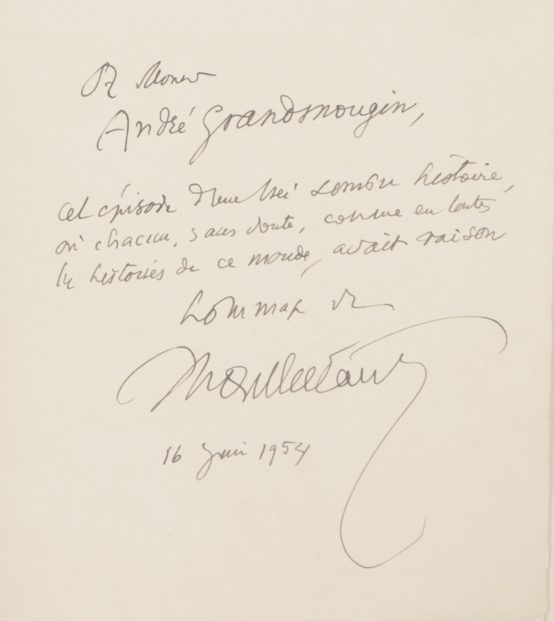 Dedication on recto of the front endpaper: „A Monsieur André Grandmougin, Cet épisode d'une très sombre histoire, où chacun, sans doute, comme en toutes les histoires de ce monde, avait raison. Hommage de Montherlant. 16 juin 1954.”
