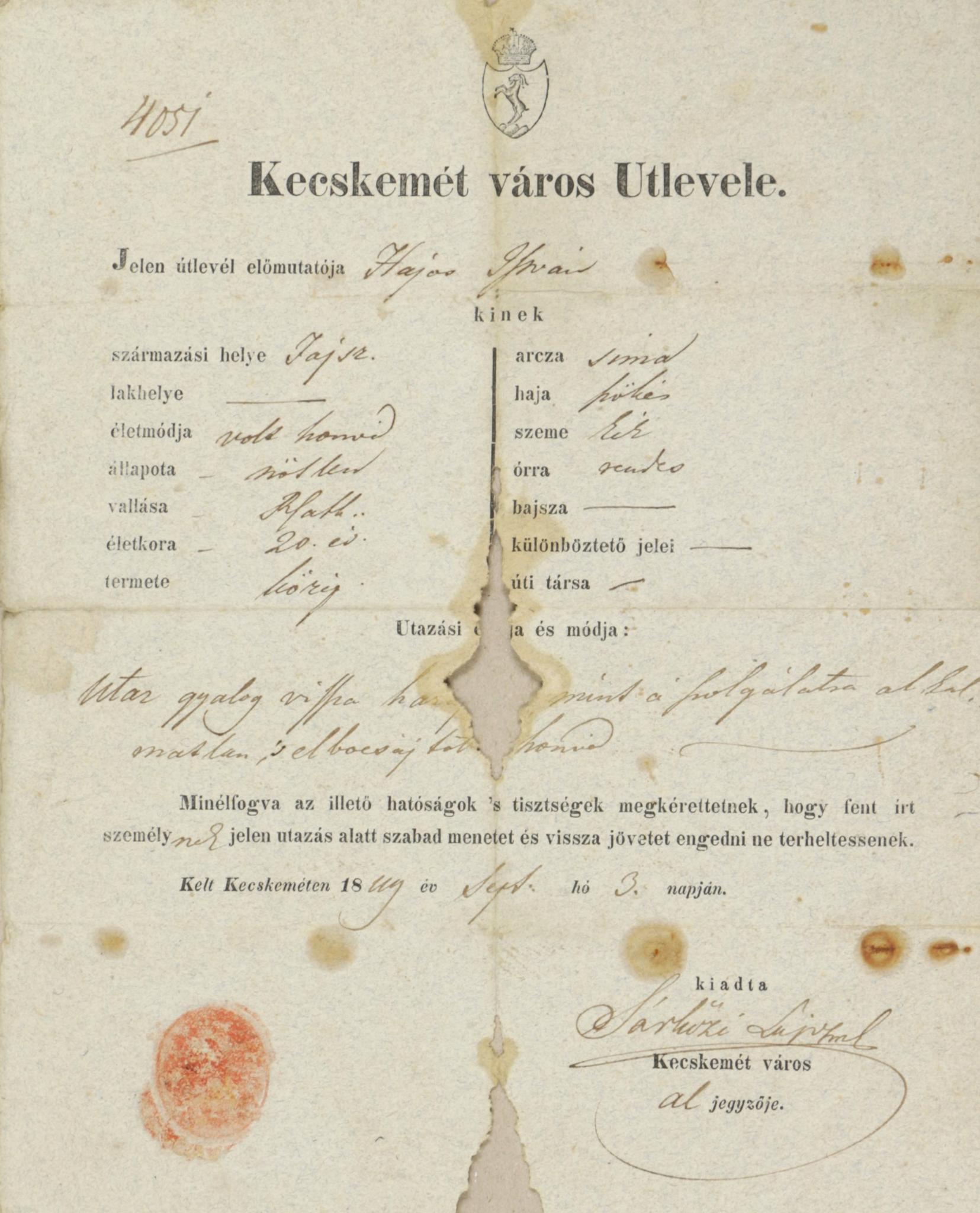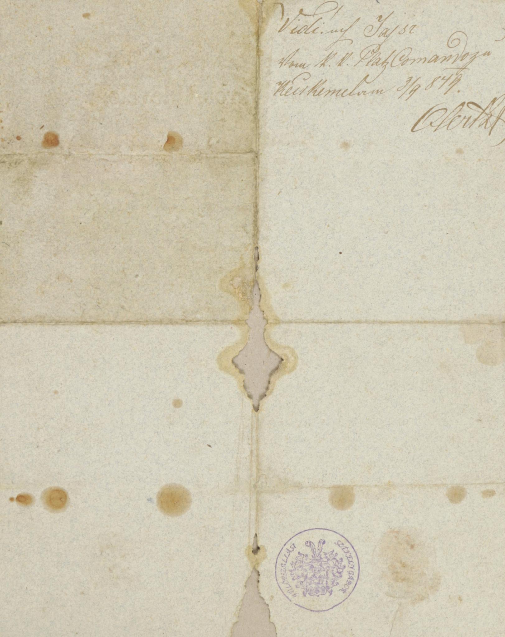 Kiállítva Kecskeméten 1849 év sept. 3. napján.  Sárközi Lajos városi aljegyző aláírásával, a város halvány viaszpecsétjével. Verzóján kézírásos „Platz comand”, parancslevél szöveg dátummal. Többször hajtva, rozsdafoltos két helyen hiánnyal. Székely Gábor gyűjteményi pecsétjével.