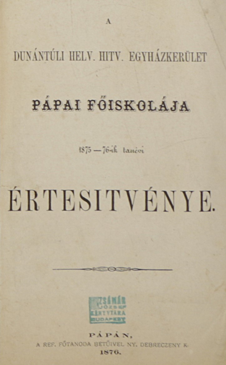 A Dunántúli Helv. Hitv. Egyházkerület Pápai Főiskola Értesítője, 1875-76.