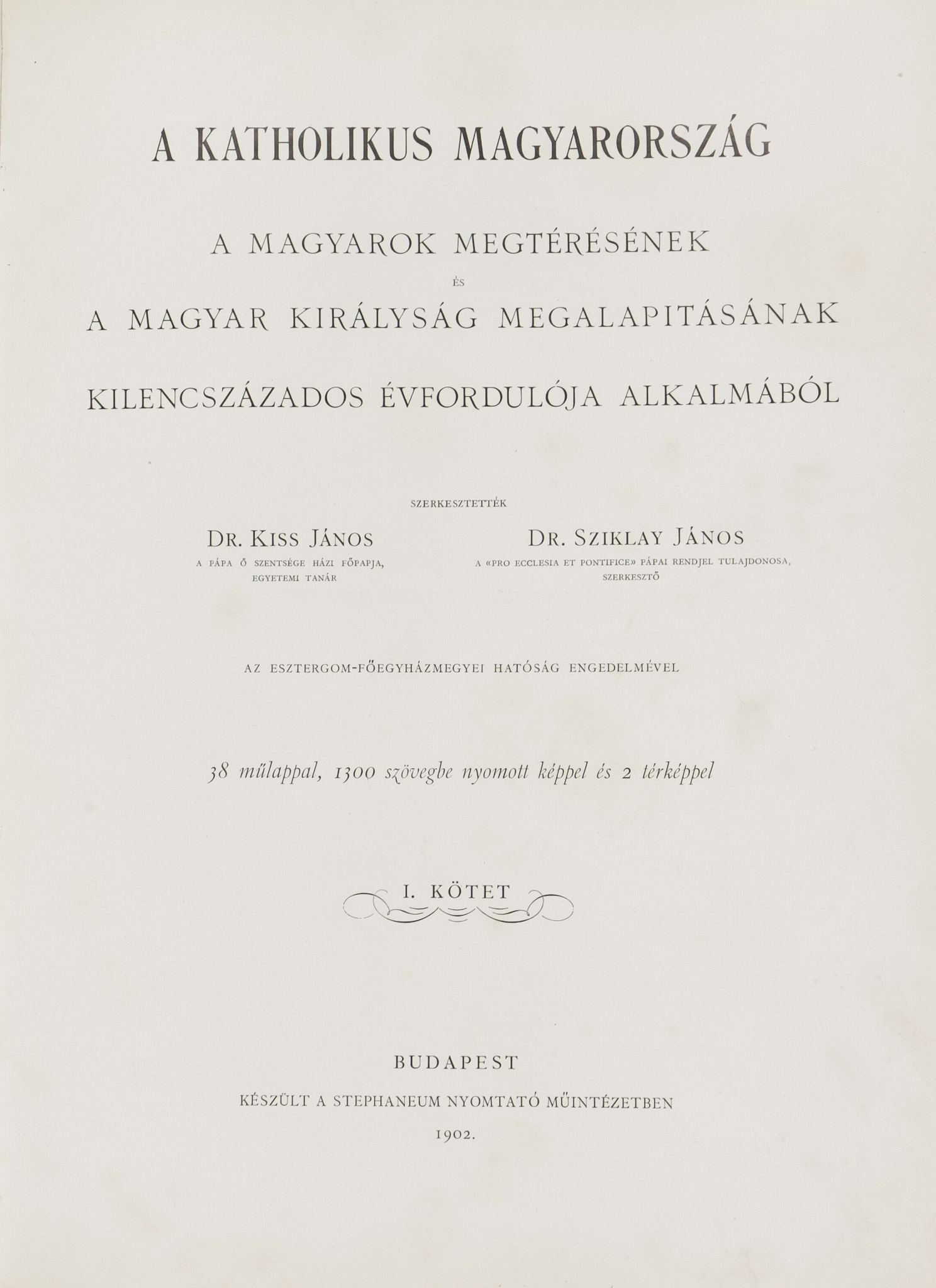 A magyarok megtérésének és a magyar királyság megalapításának kilencszázados évfordulója alkalmából. Szerkesztették: Dr. Kiss János, Dr. Sziklay János. Az Esztergom-főegyházmegyei hatóság engedelmével. 38 műlappal, 1300 szövegbe nyomott képpel és 2 térképpel.