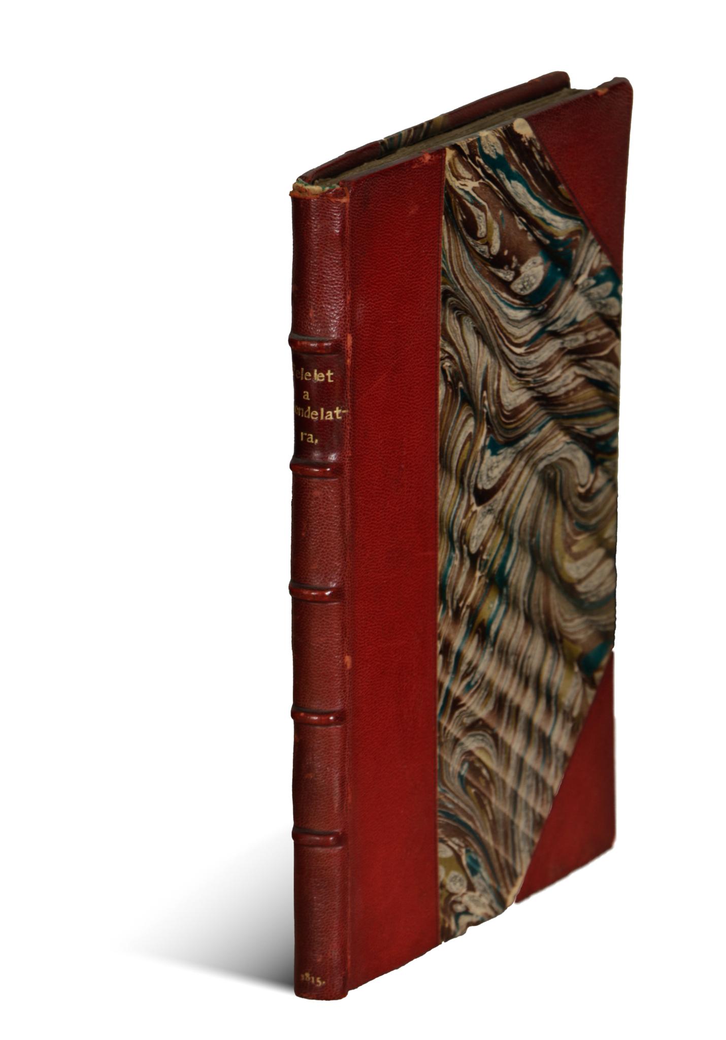 Korabeli, bordázott gerincű fél-maroquin kötés. A gerincen aranyozott címvignettával, kétszínnyomású címlappal. Körülvágatlan példány. Kivételesen széles margójú, luxuspéldány (lásd képek). Mérete: 18,5×12,2 cm