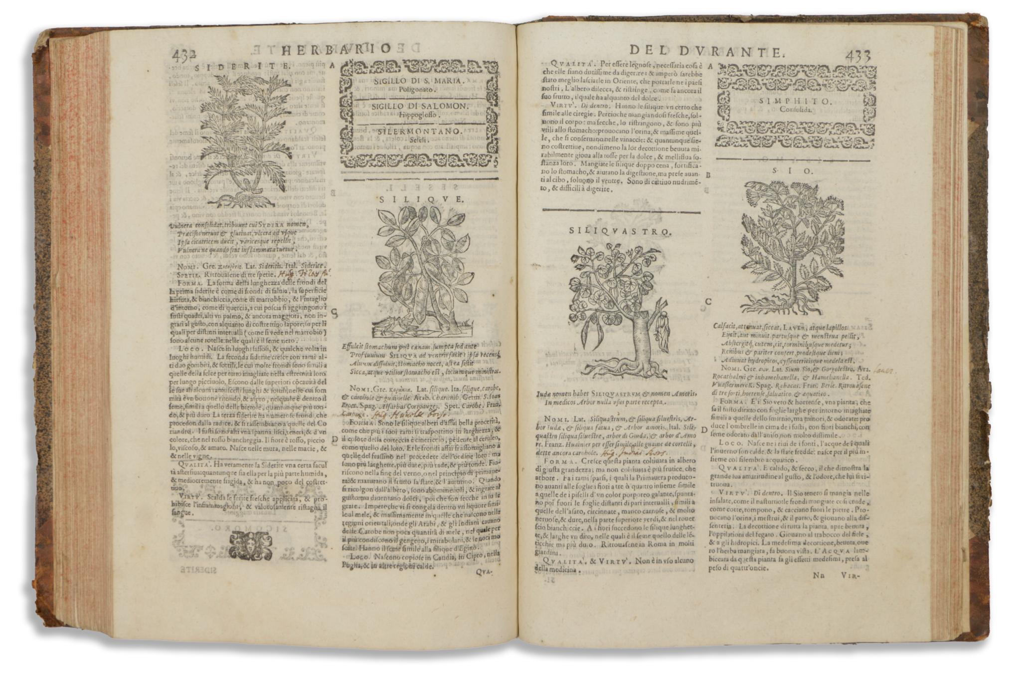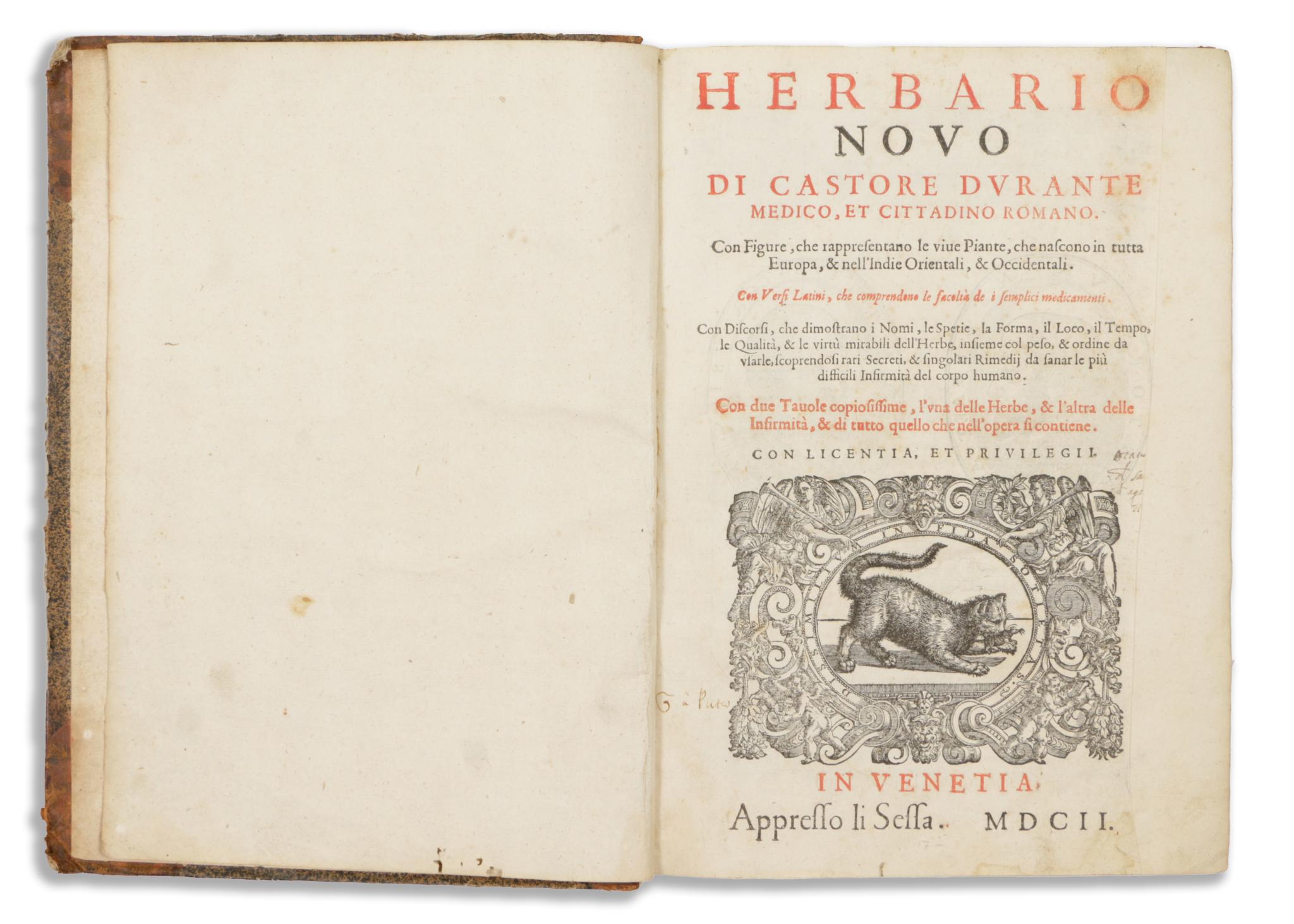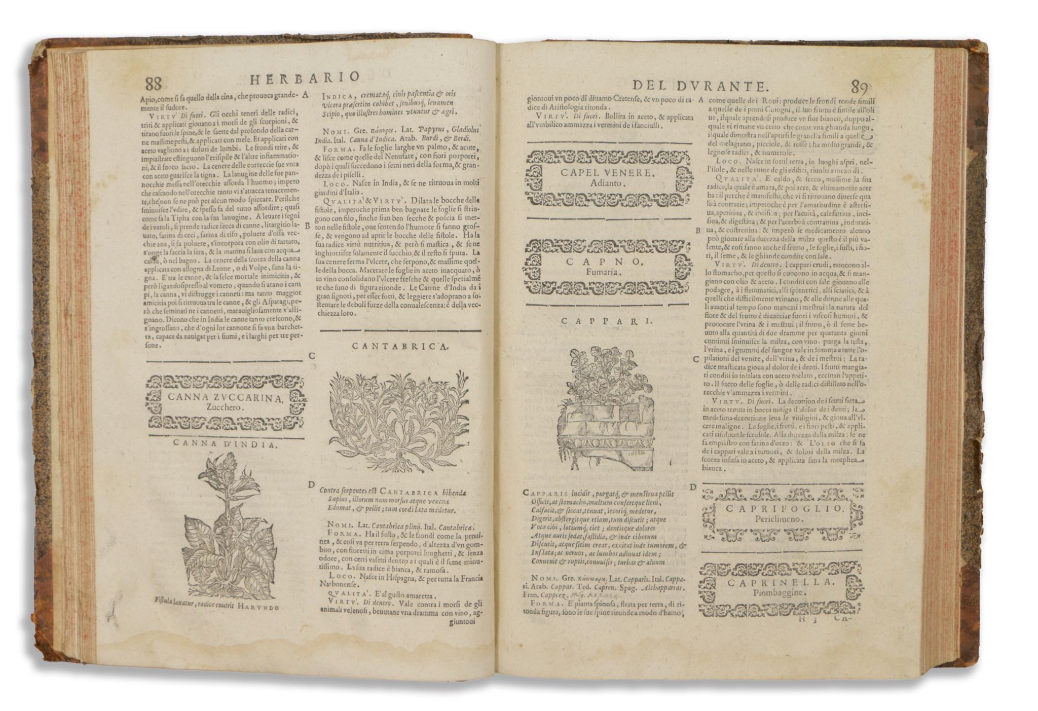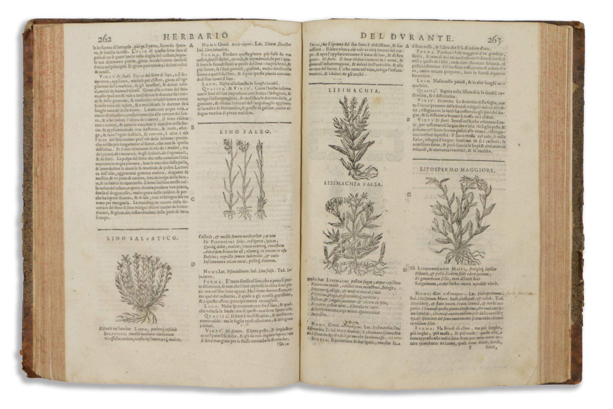 Castore Durante 16. századi itáliai tudós volt, jelen műve híres herbáriumának második kiadása, kibővítve a végén található 110 fametszetből álló sorozattal, amely az első kiadásban (1585) nem jelent meg. A címlapon és a végén fametszetű nyomdászjelvény, 2 fametszetű portré a cím hátoldalán, 965 fametszet a szövegben, és 110 hozzáadott fametszet 10 lapon a végén. A növények leírását, valamint orvosi felhasználásukat és gyógyító tulajdonságaikat tartalmazza. A műben részletesen ismertetett növények Európából, valamint Kelet- és Nyugat-Indiából származnak, és információkat tartalmaznak arról, hogyan lehet őket azonosítani a bennszülött környezetükben.