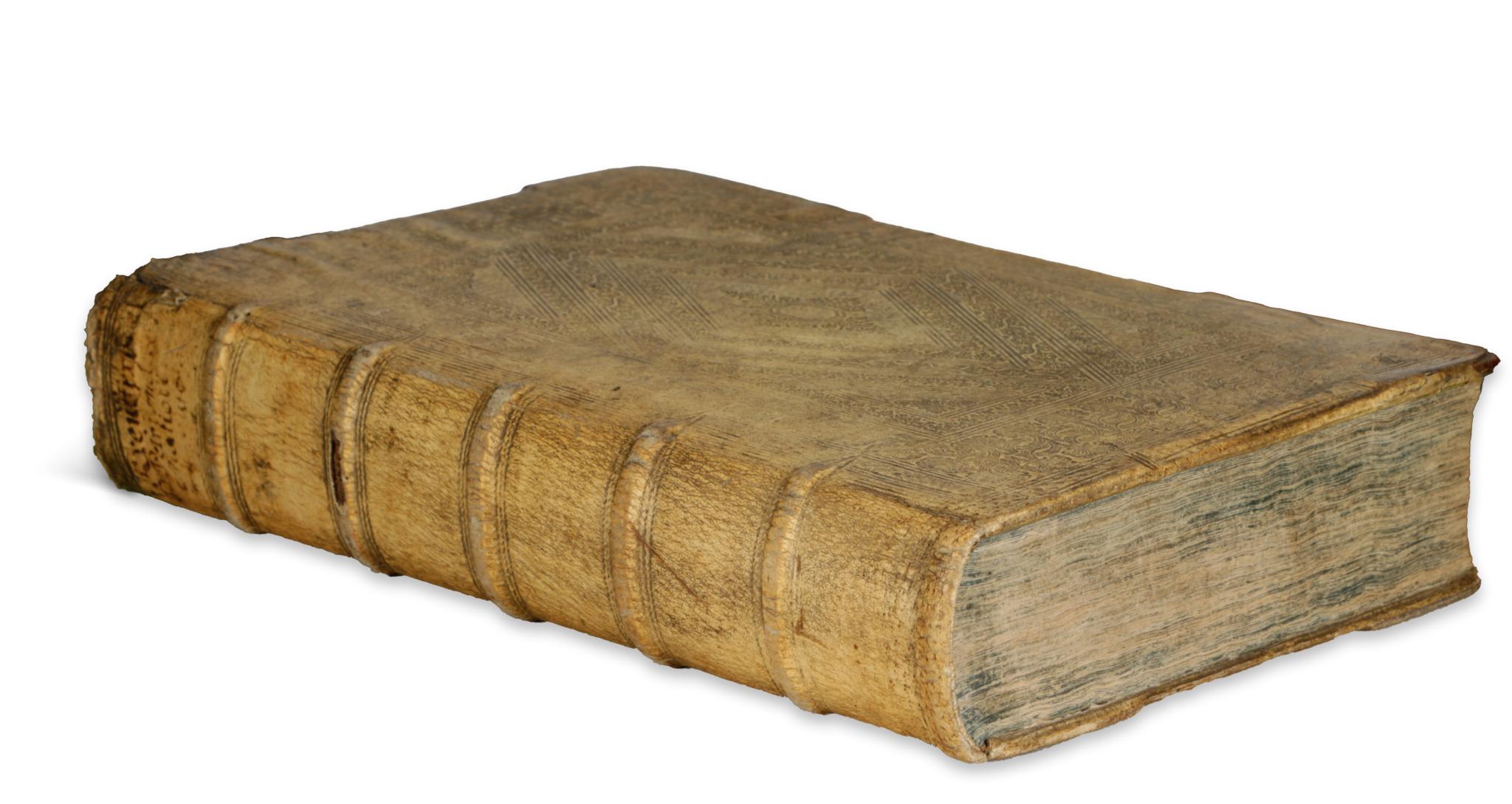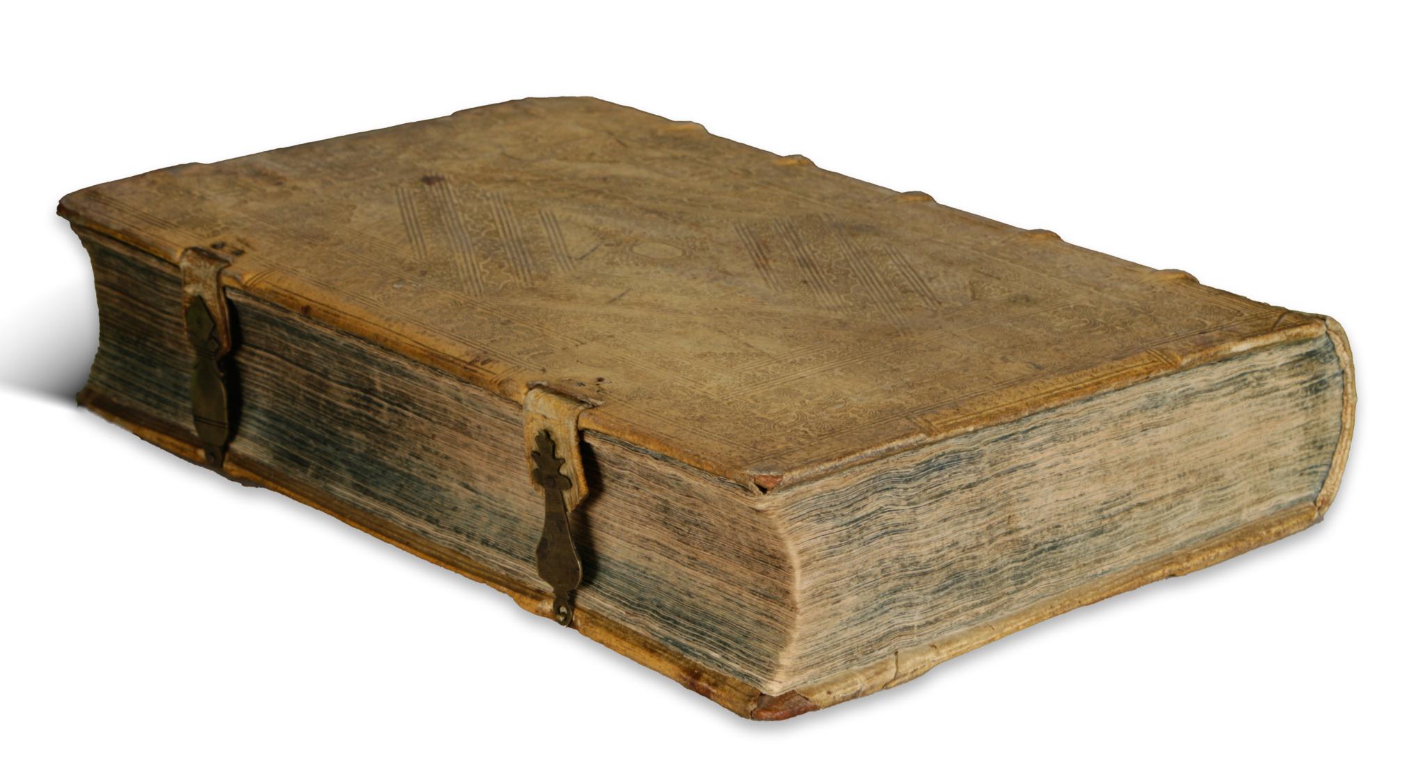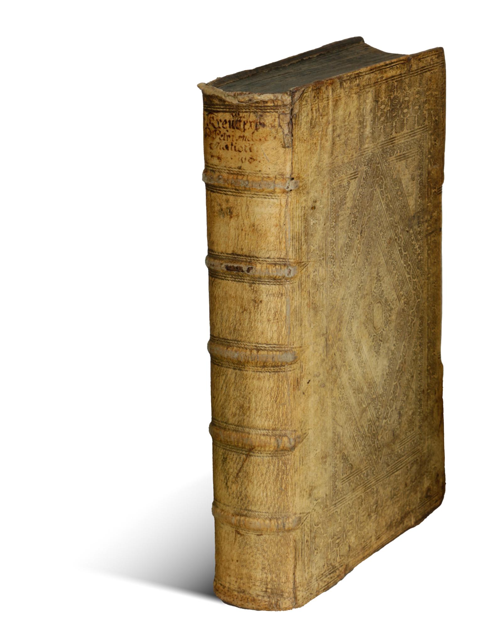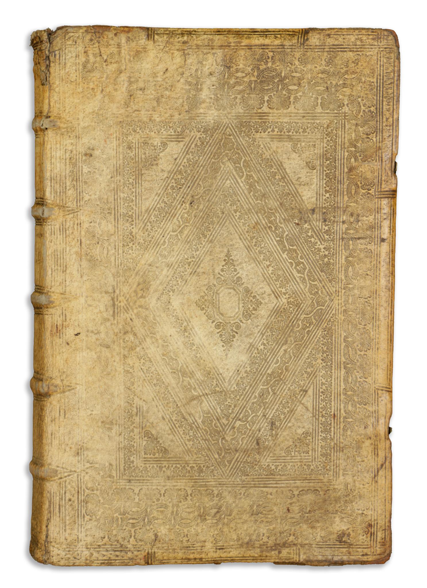 Korabeli pergamenkötésben. A táblákat vaknyomásos virágok, növények, illetve geometrikus formák díszítik. Bordázott gerinc. Eredeti csatokkal. Enyhén kopott, szép példány, gyönyörű, eredeti kötésben.