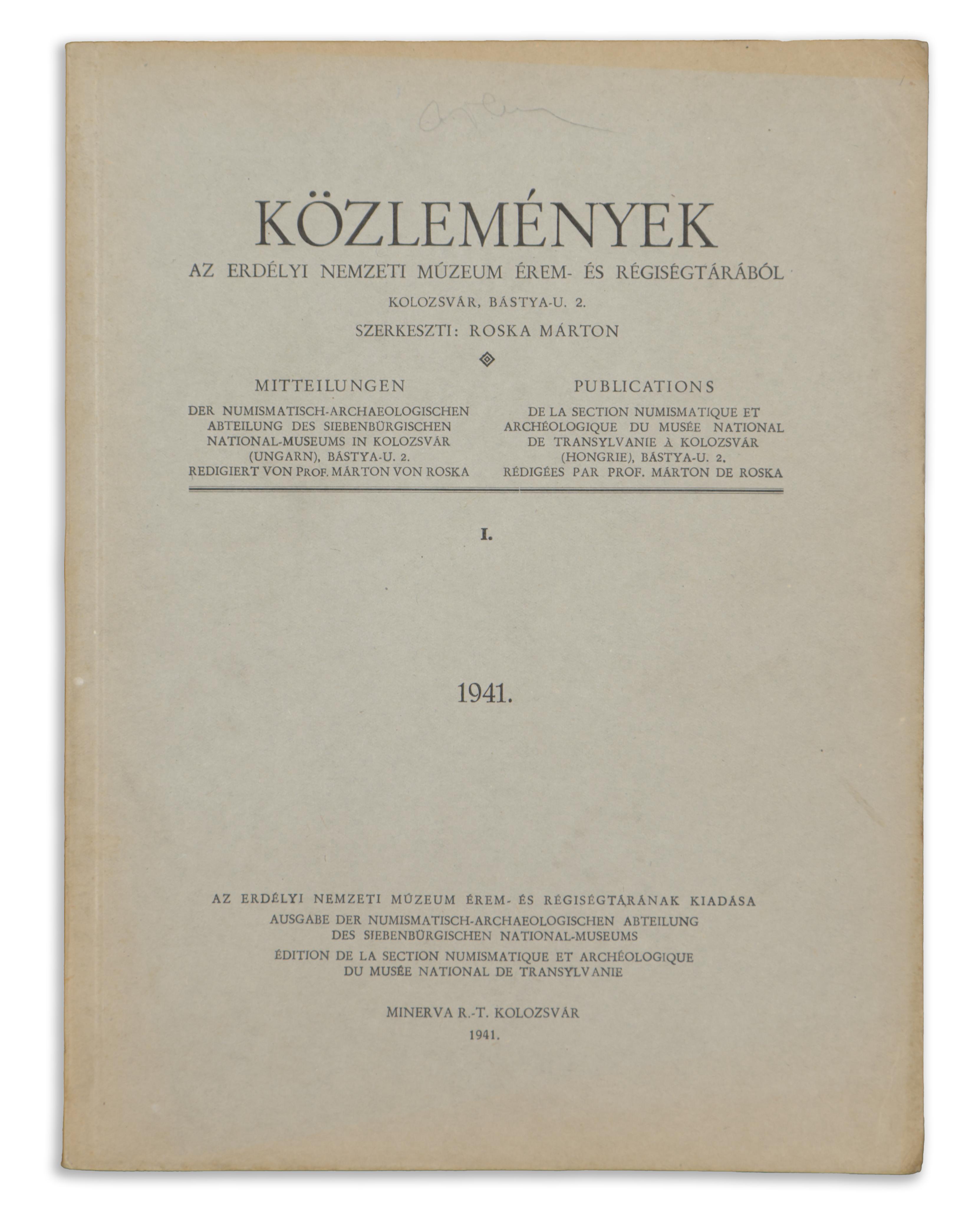 Közlemények az Erdélyi Nemzeti Múzeum Érem- és Régiségtárából. I. kötet. Szerkeszti: Roska Márton. Kolozsvár, 1941. Erdélyi Nemzeti Múzeum Érem- és Régiségtára (Minerva Rt. [ny.])