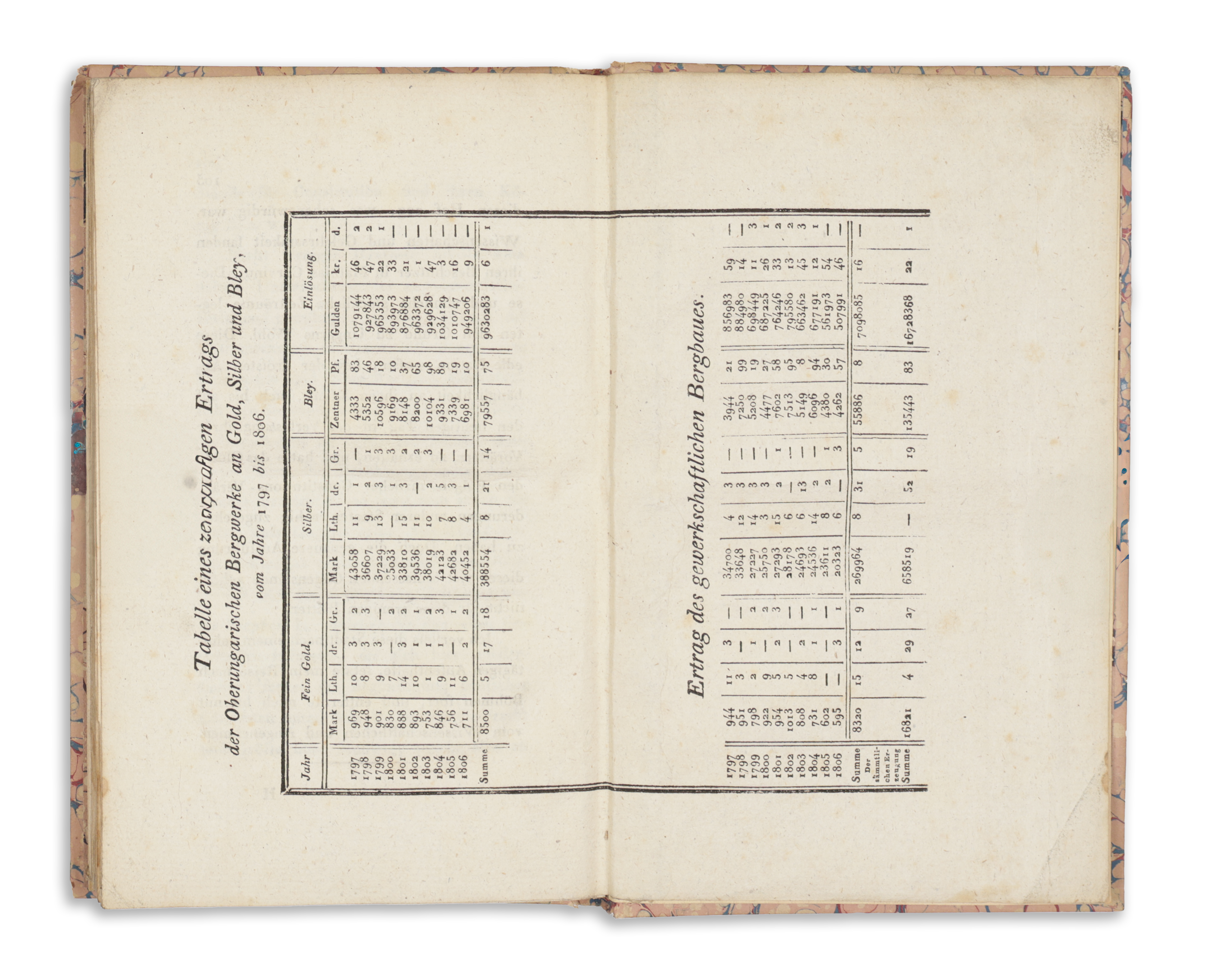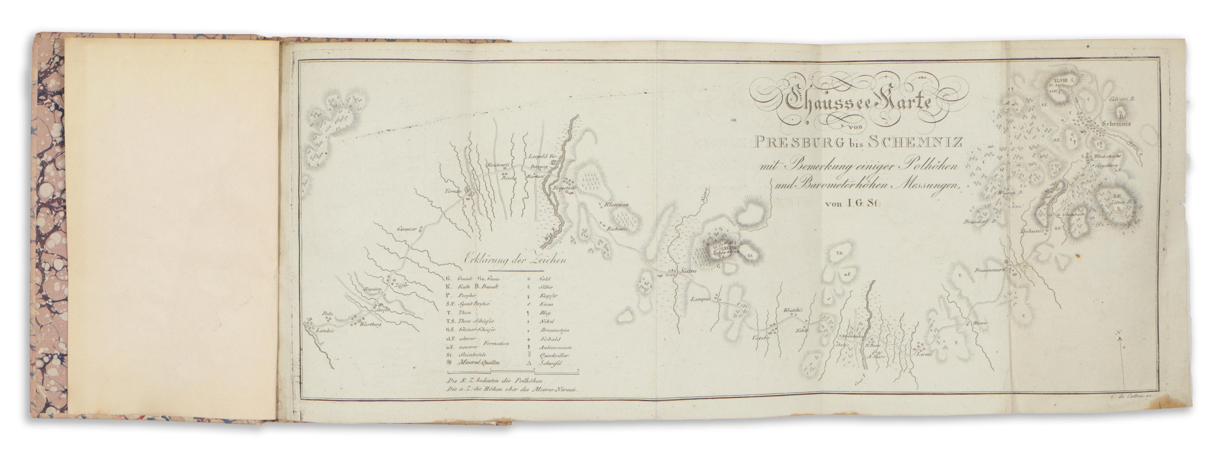Wien, 1808. Degen. 1 kihajtható rézm. térkép + VII + 105 p. + 1 kétoldalas mell. A térképen: Chaussee Karte von Presburg bis Schemniz... C. de Catton metszete. (18×47cm) A tabellán: A felső-magyarországi arany-, ezüst- és ólombányák tízéves hozamának táblázata.