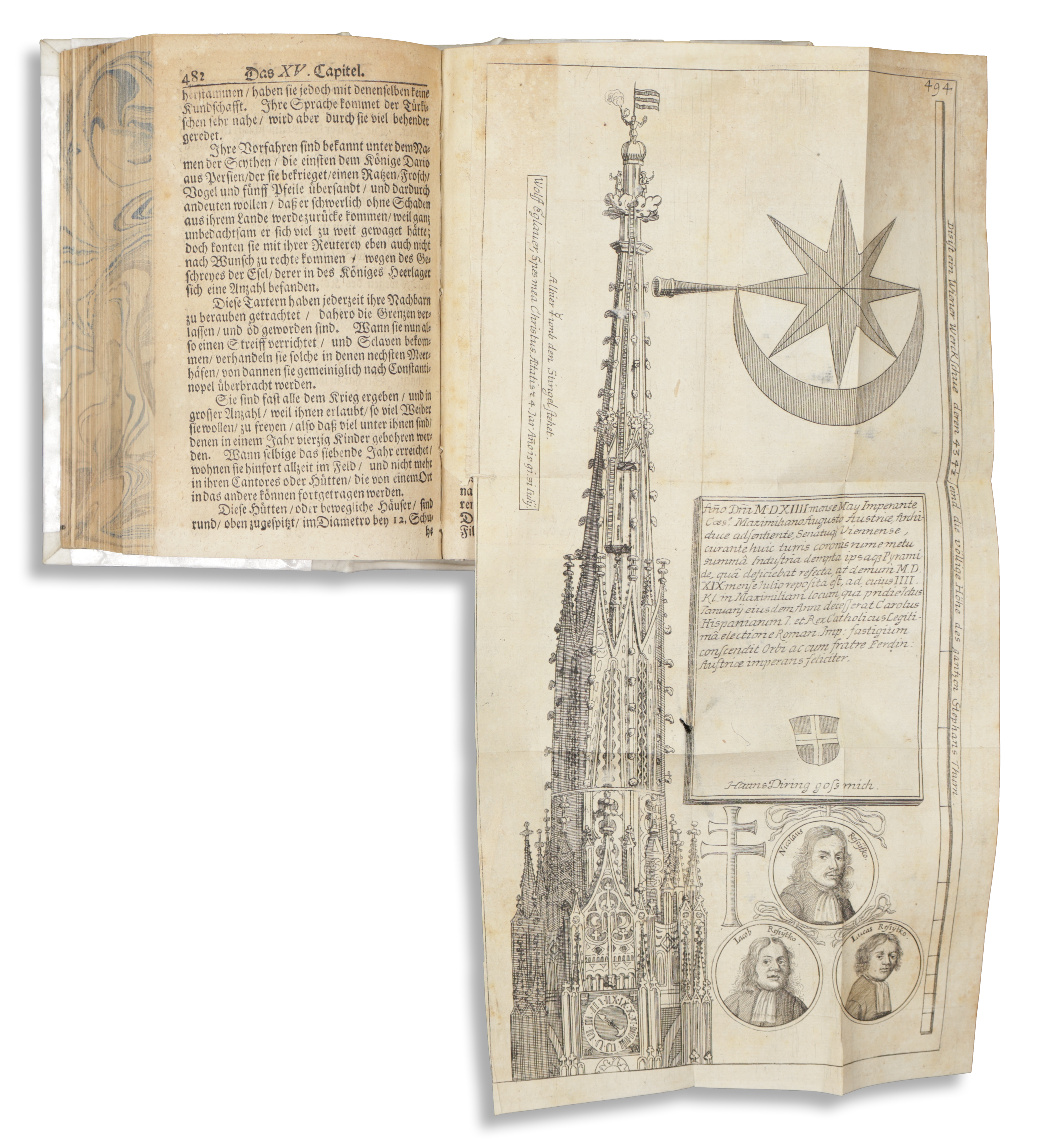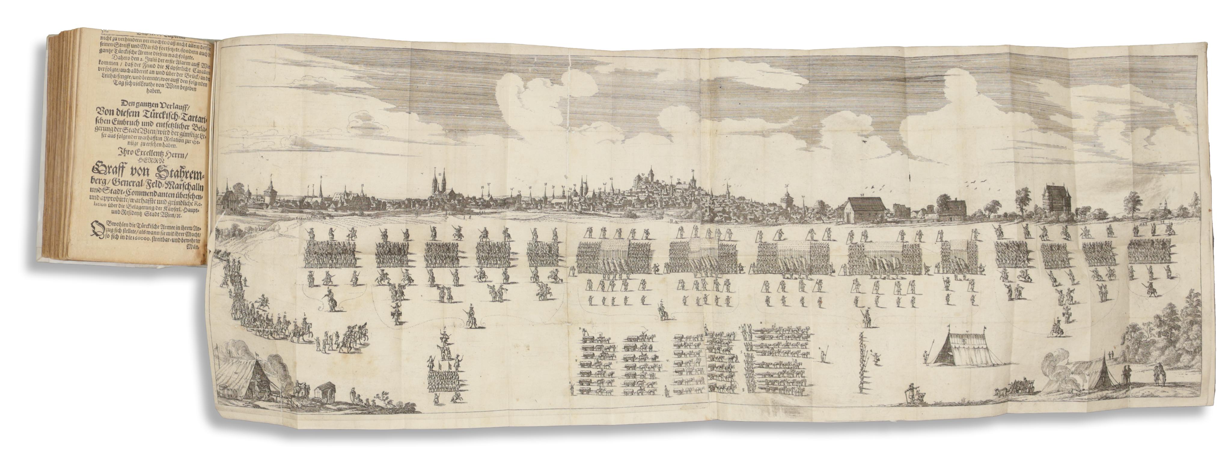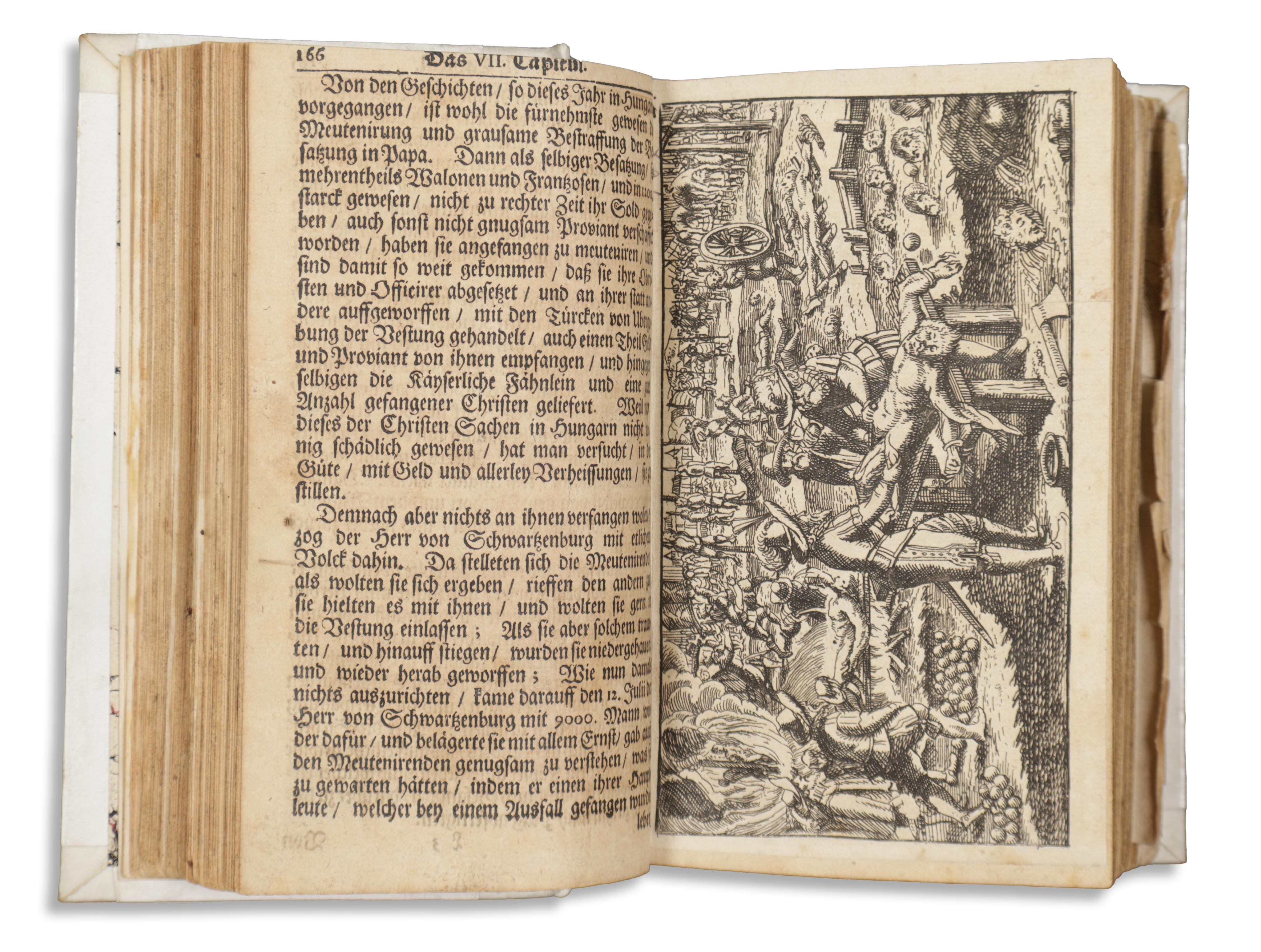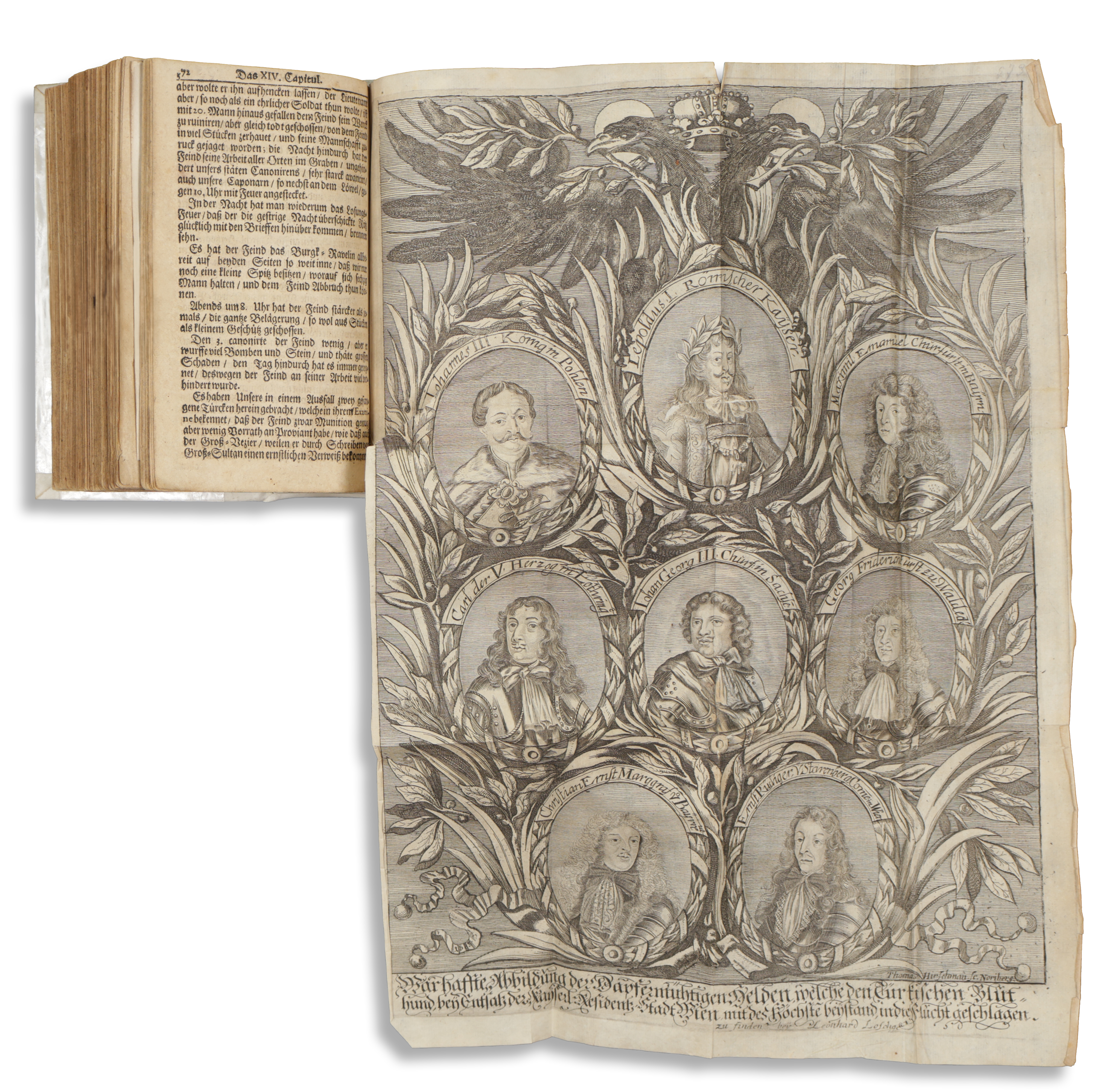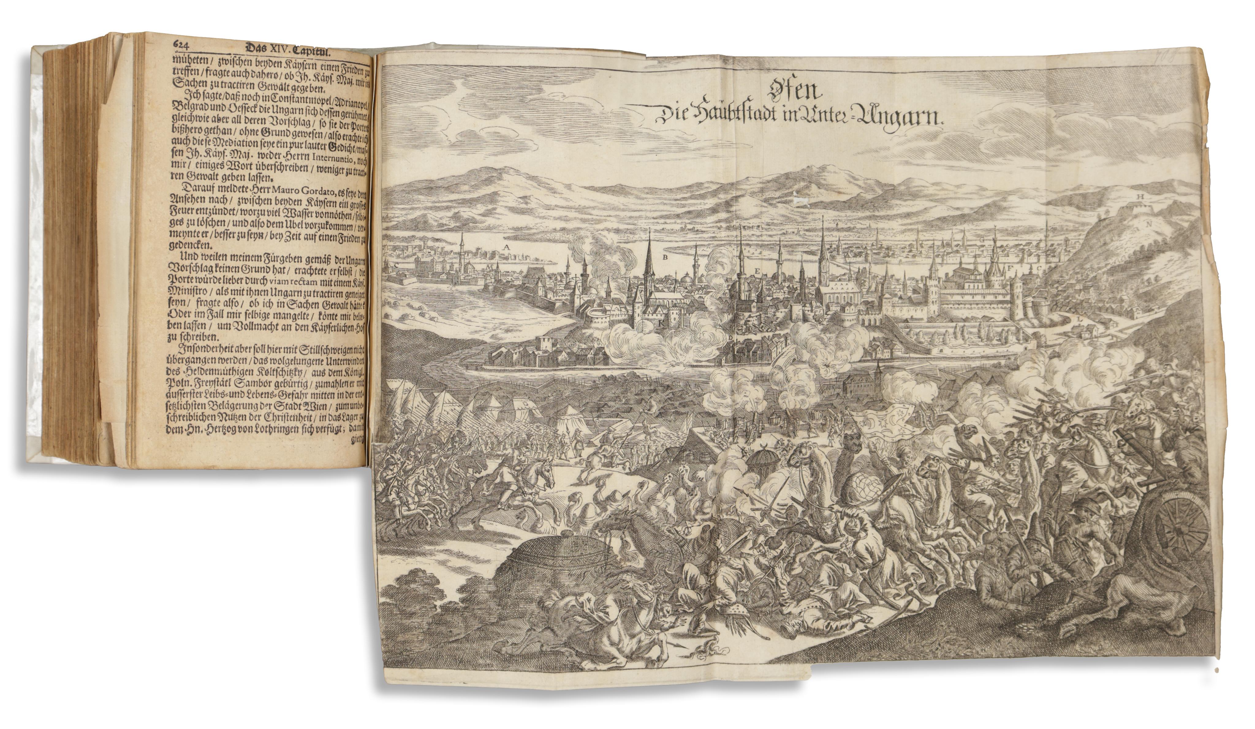 This lavishly illustrated chronicle of the Turkish wars depicts many cities and battles, as well as various scenes of torture and the busts of many military leaders with laurel wreaths. The large fold-out engravings show, among others, the siege of Buda (1684), Visegrád, Santa Maura, Esztergom (1685), Érsekújvár, Korón [Coron / Koron] (1685), Kalamata (1685), Eperjes [Prešov] or Modon [Methoni] (1686).
