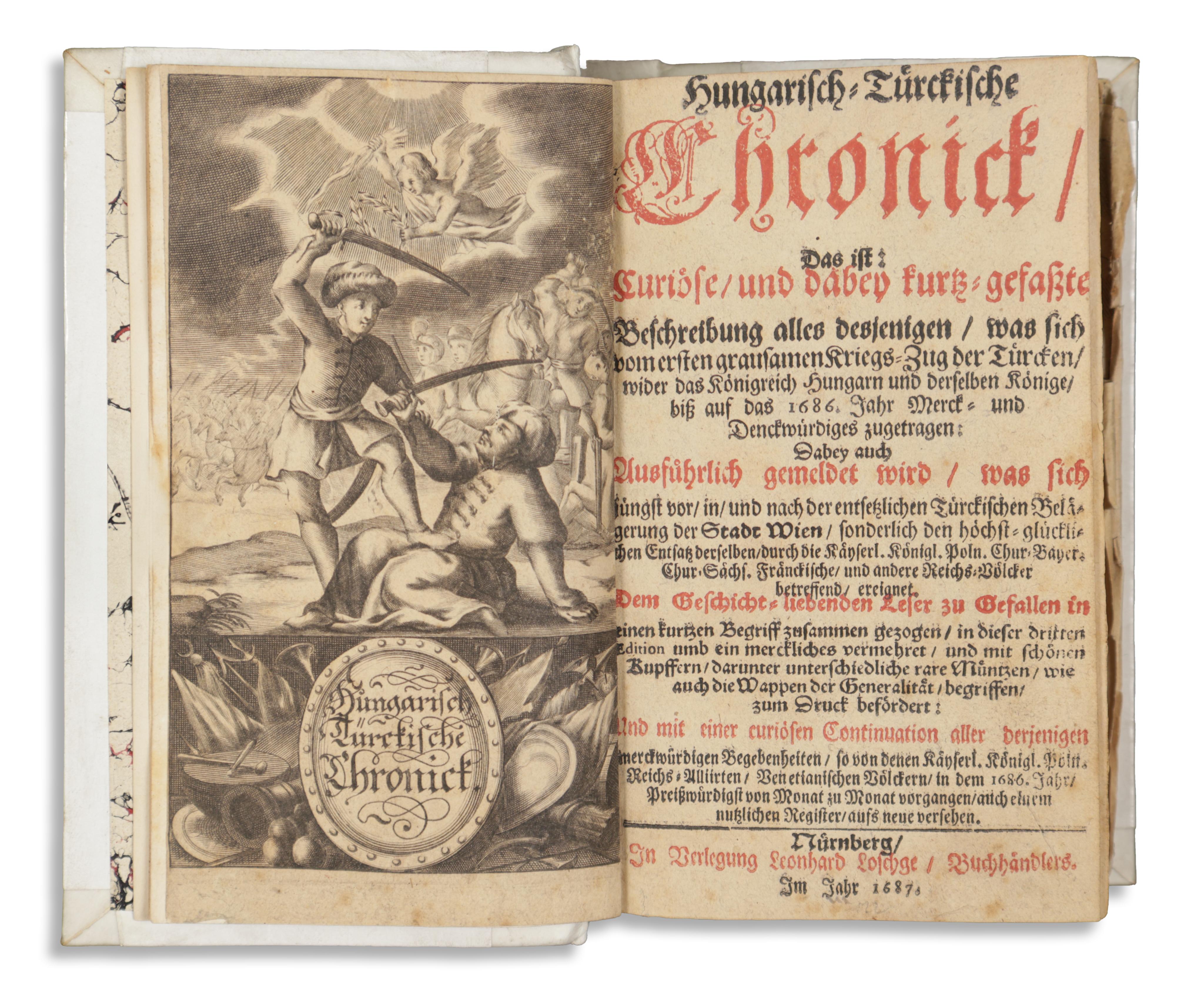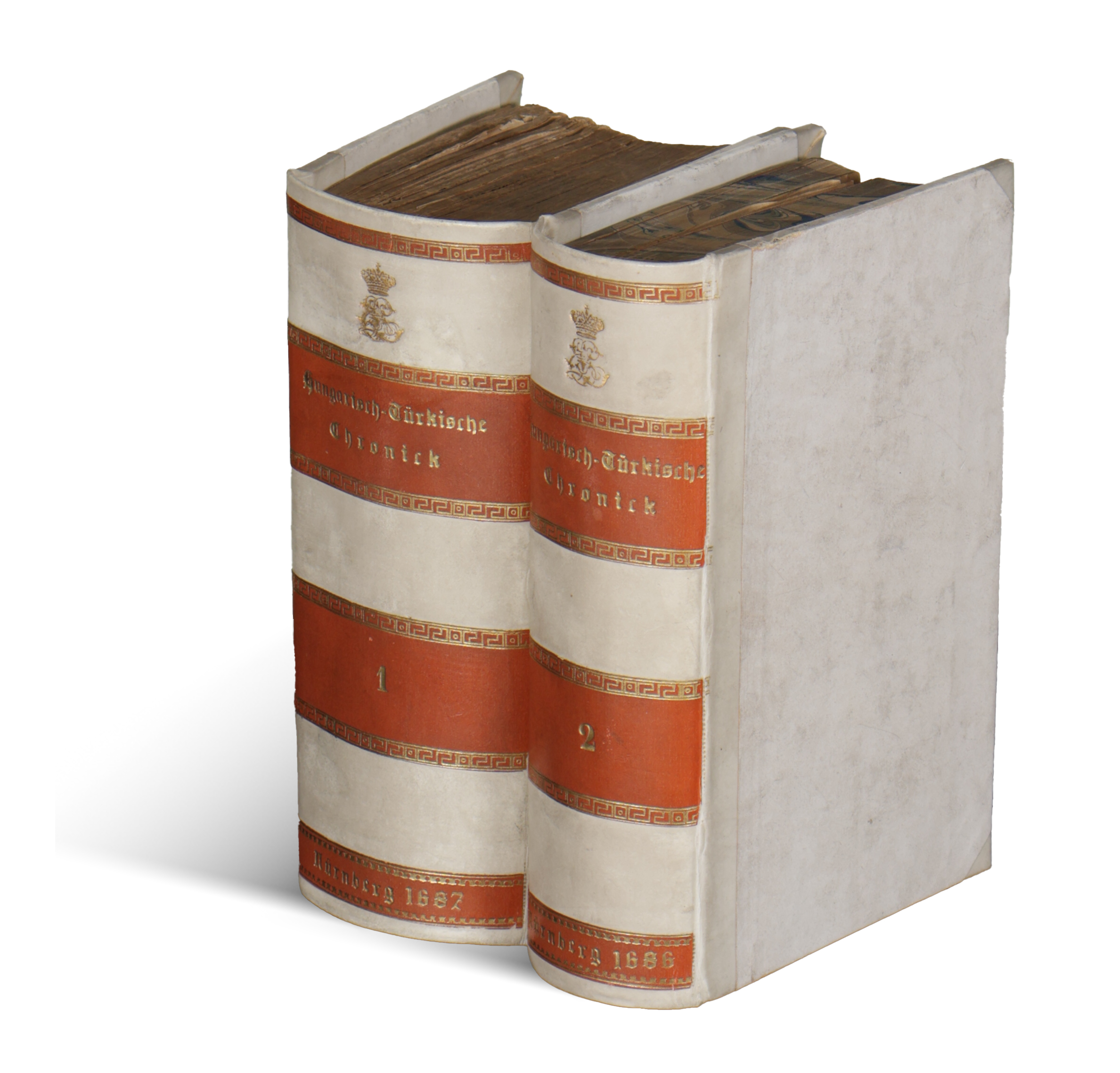 Band 1: Hungarisch-Türkische Chronick. Das ist: Curiöse und dabey kurz-gefaßte Beschreibung alles desjenigen / was sich vom Ersten grausamen Kriegs-Zug der Türken / wider das Königreich Hungarn und derselben Könige / bis auf gegenwärtiges 1686.Jahr Merk- und Denkwürdiges zu getragen hat. Band 2: Curiöse Continuation oder Fortsetzung Der Hungarisch-Türkischen Chronik. Darinnen die raresten und merkwürdigsten Begebenheiten / Schlachten und Victorien der christlichen Kaserl. Königl. Polnischen / Reichs-Allierten und Venetianischen Armeen.