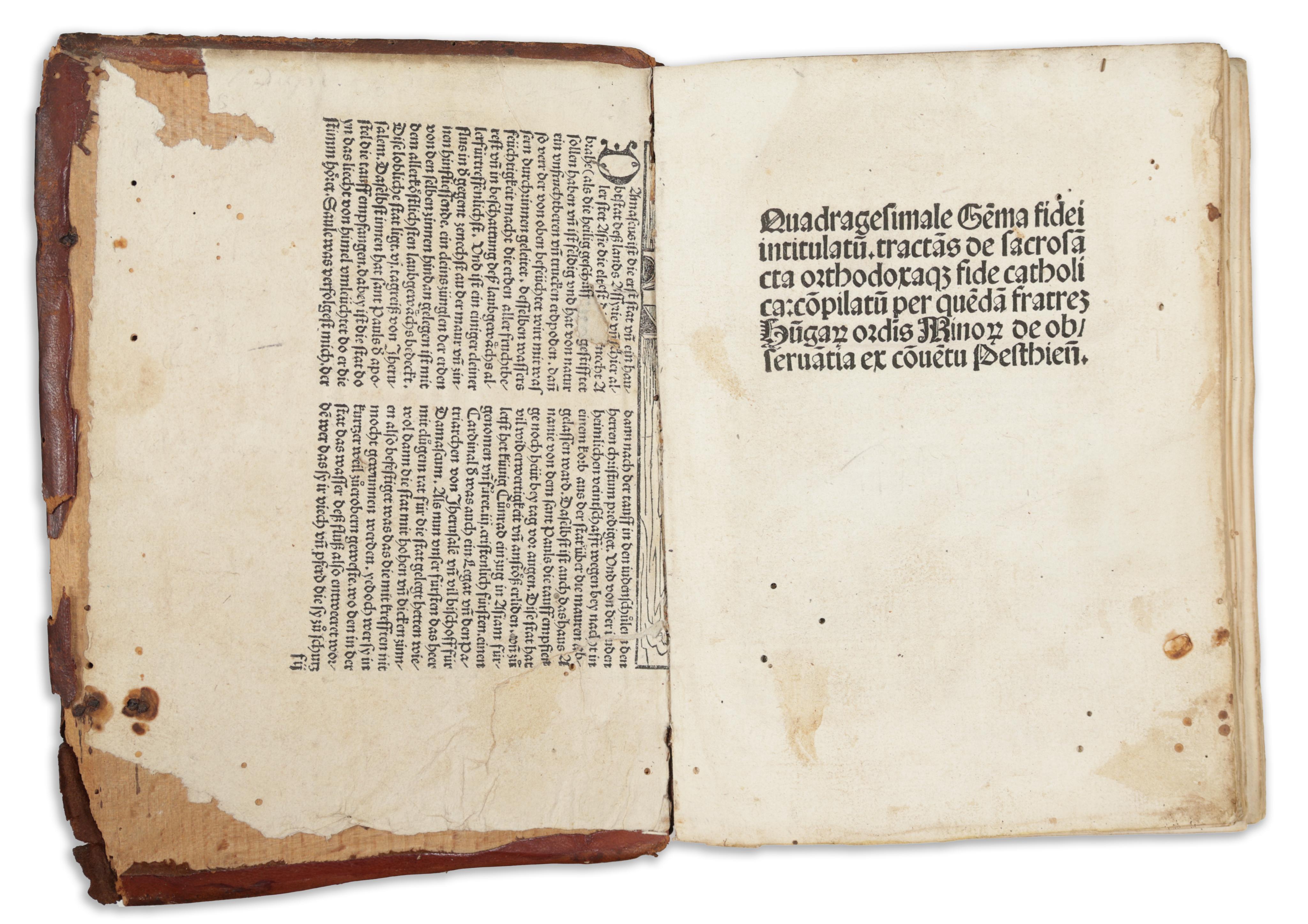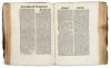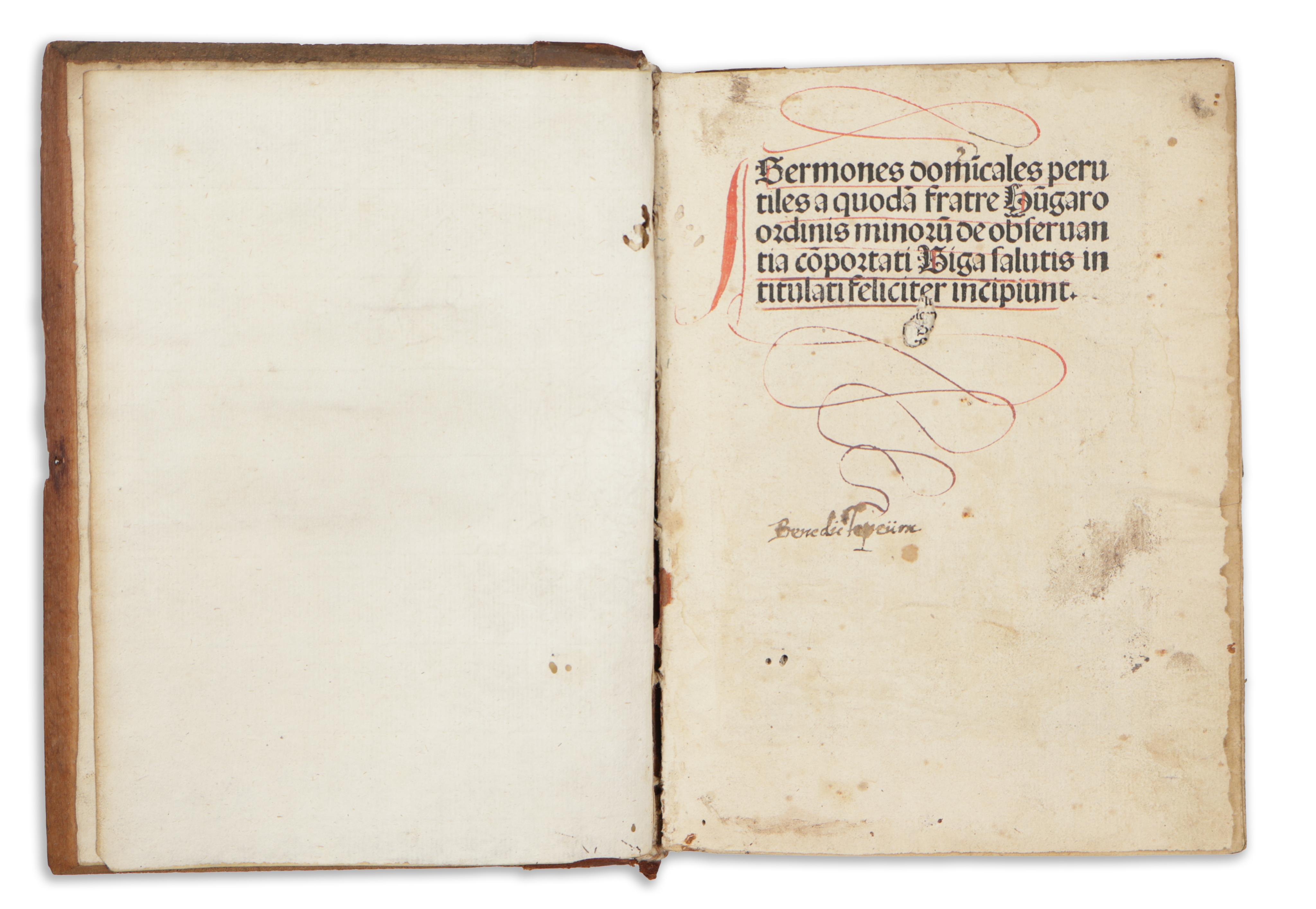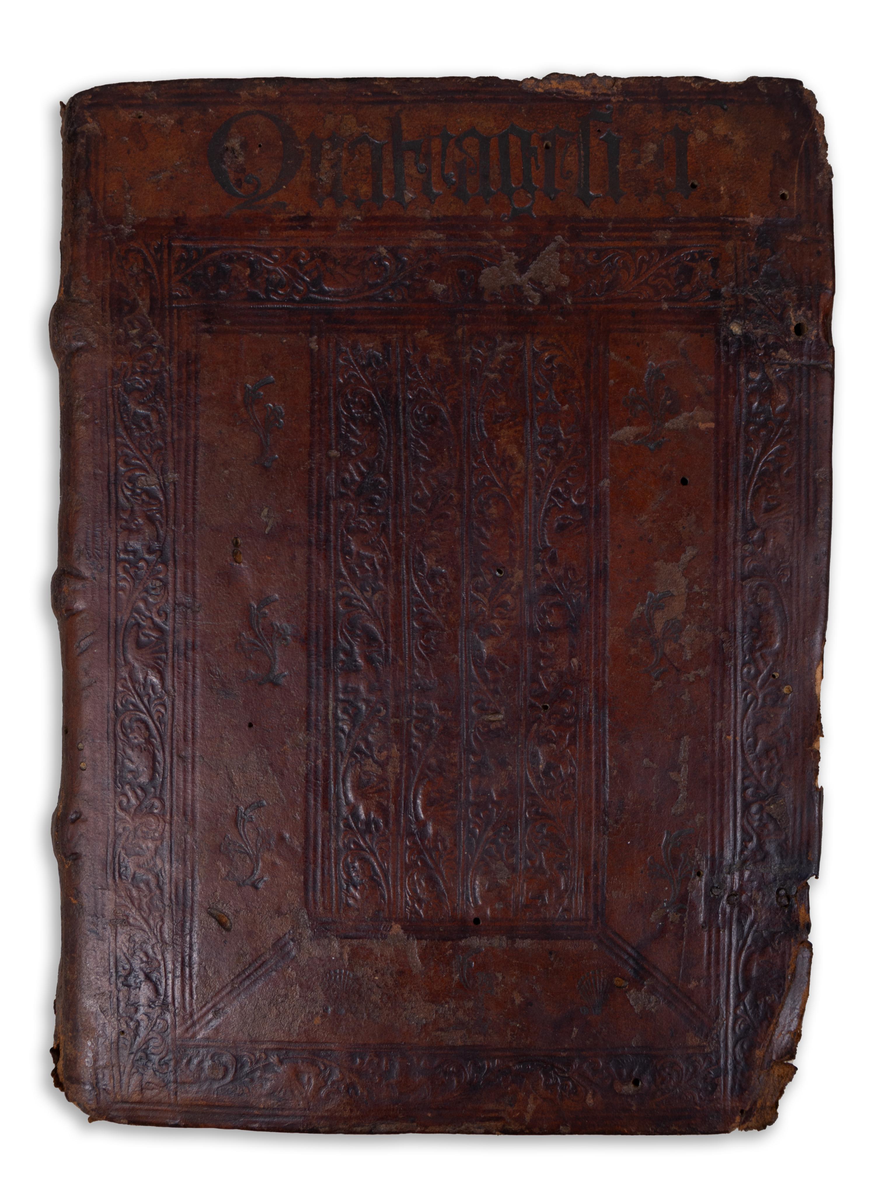 Második kiadás. Vörös inciálékkal díszitett. Későbbi félbőr-kötésben, fatáblákkal. Bordázott, vaknyomással díszitett gerinc, címvignettával. Az első három levél közepén kisebb lyuk, némi szövegveszteséggel. Korabeli bejegyzésekkel. Különben szép, tiszta példány.