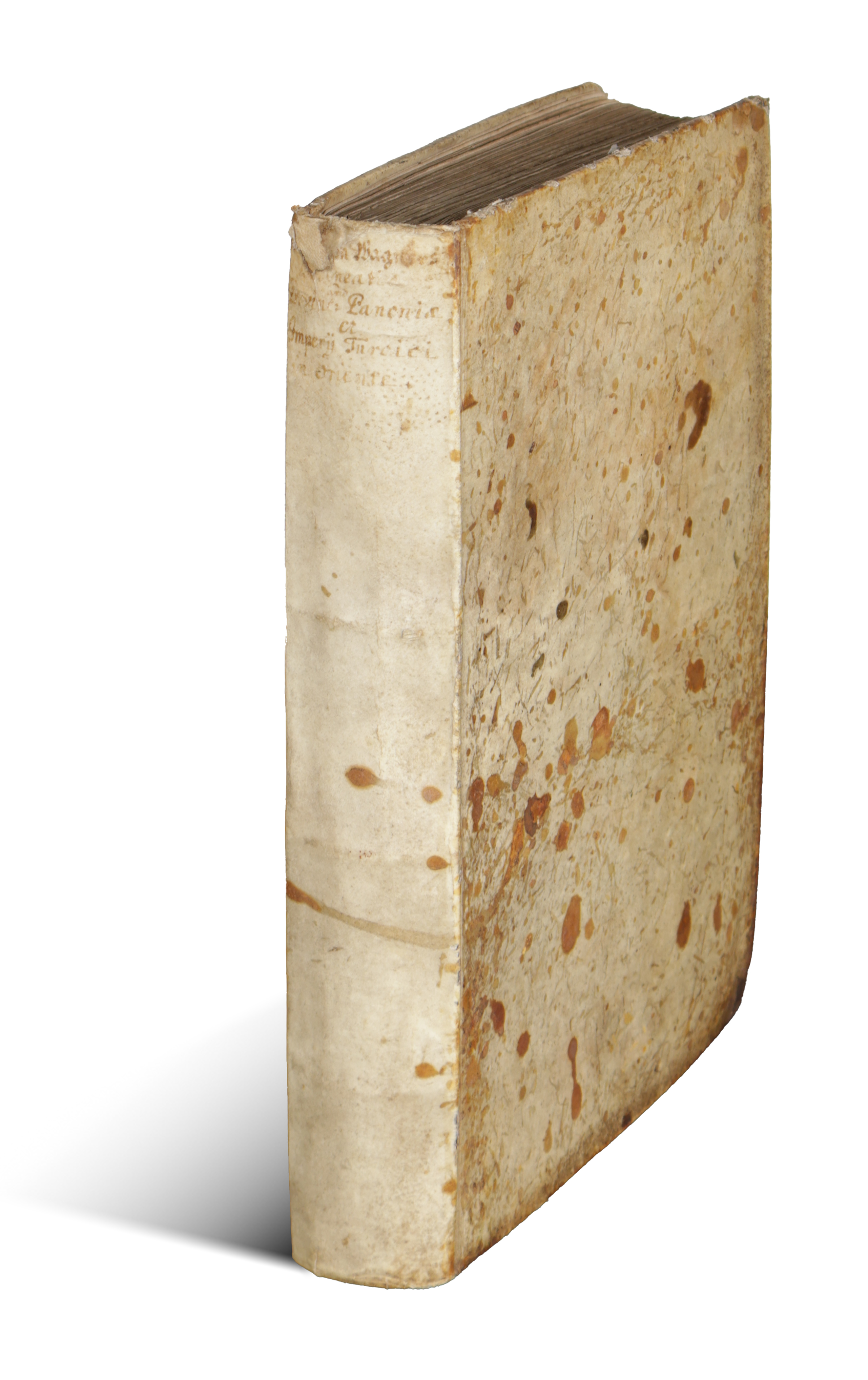 Pergamen-kötésben, a borító erősen foltos, a gerincén mérsékelten.
