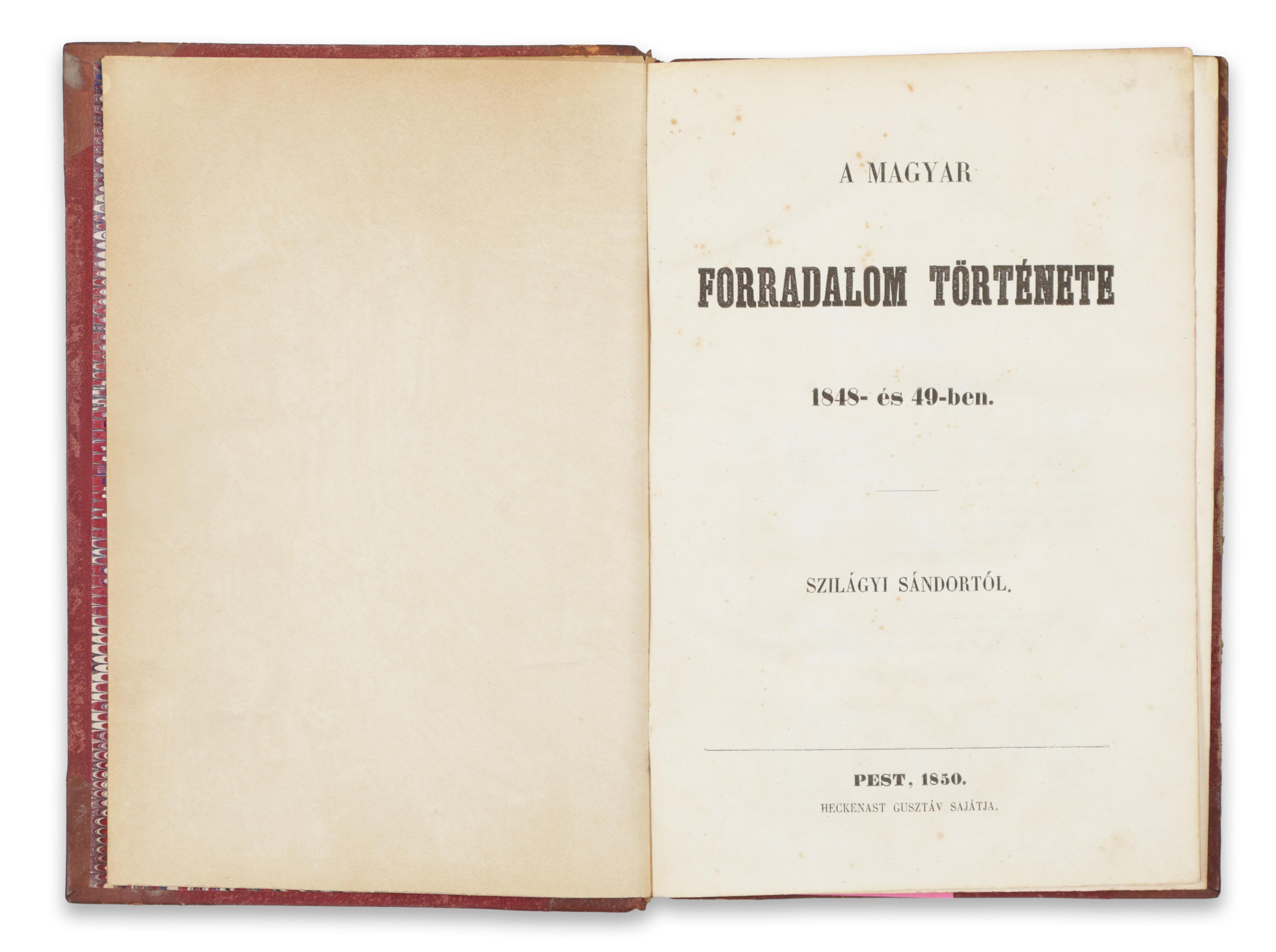 Korabeli, bordázott, aranyozott gerincű félbőr kötésben, márványozott előzéklapokkal és lapélekkel.