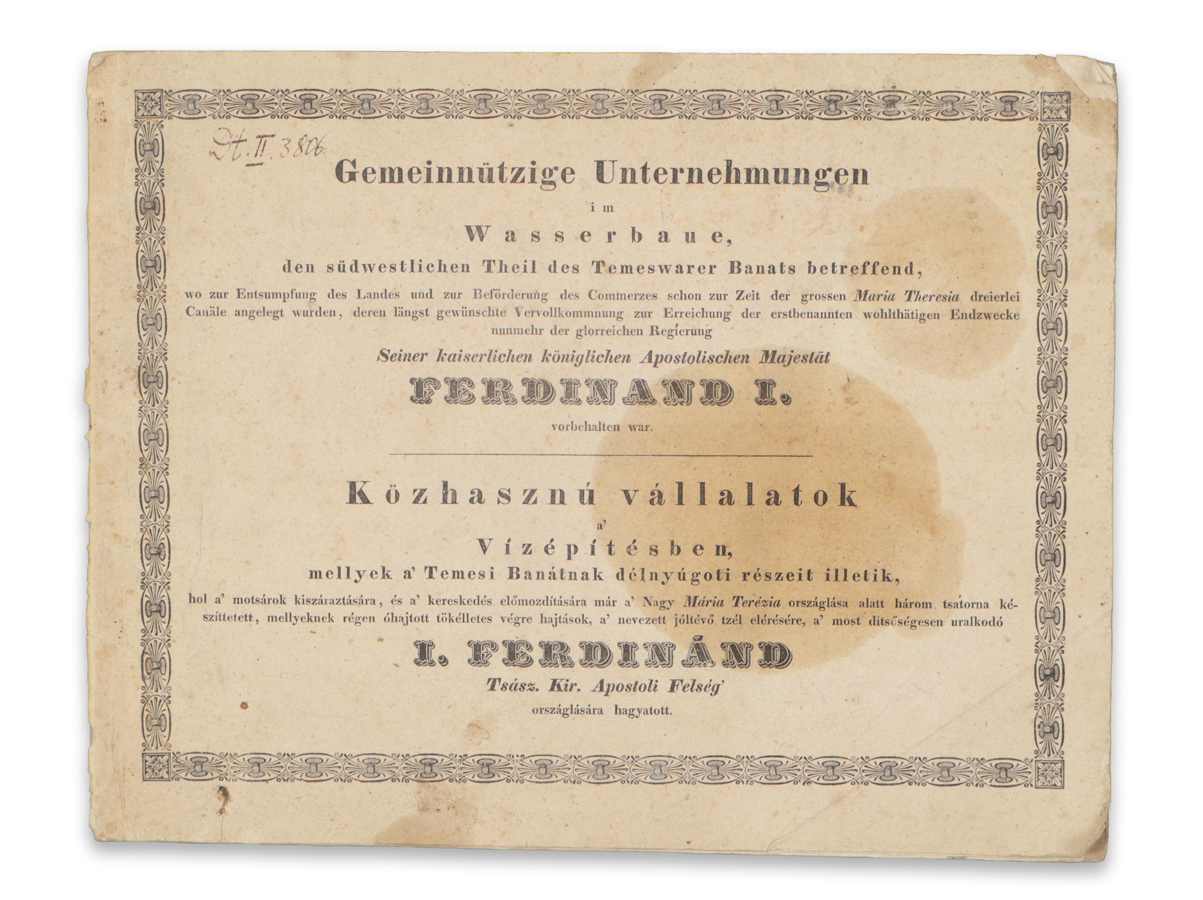Hydrotechnische Andeutungen als vieljährige Erfahrungs-Beiträge zur Sicherstellung vor der Überschwemmung ... – Vízépítményi Jegyzetek, mint sok esztendei Tapasztalásból gyüjtött Pótlékok. … A borítón: Gemeinnützge Unternehmungen im Wasserbaue, , den südwestlichen Theil des Temeswarer Banats betreffend, … – Közhasznú vállalatok a’ Vízépítésben, mellyek a’ Temesi Banátnak délnyúgoti részeit illetik, …