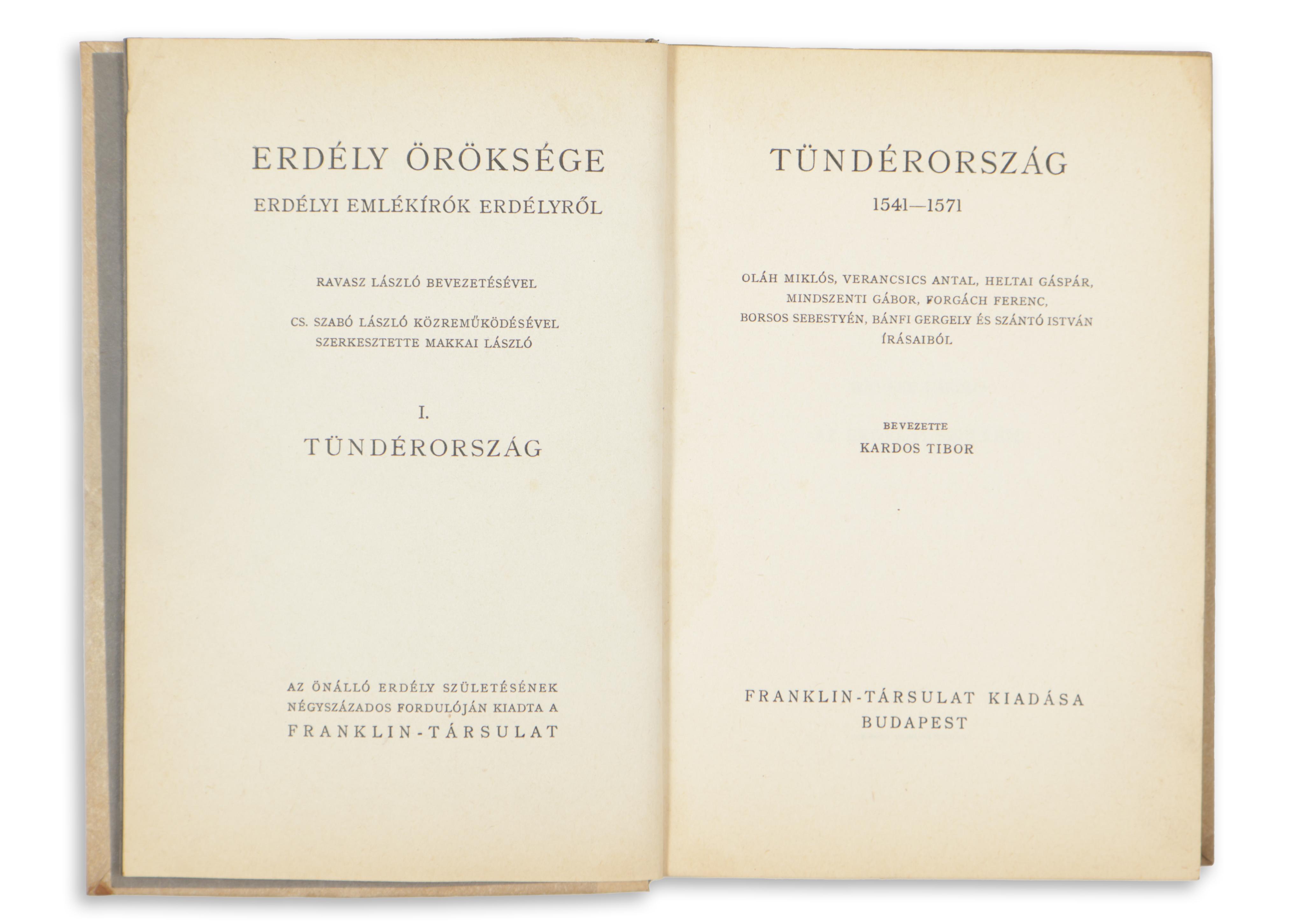 I.: Tündérország. 1541-1571. Oláh Miklós, Verancsics Antal, Heltai Gáspár, Mindszenti Gábor, Forgách Ferenc, Borsos Sebestyén, Bánfi Gergely és Szántó István írásaiból. Bevezette Kardos Tibor.