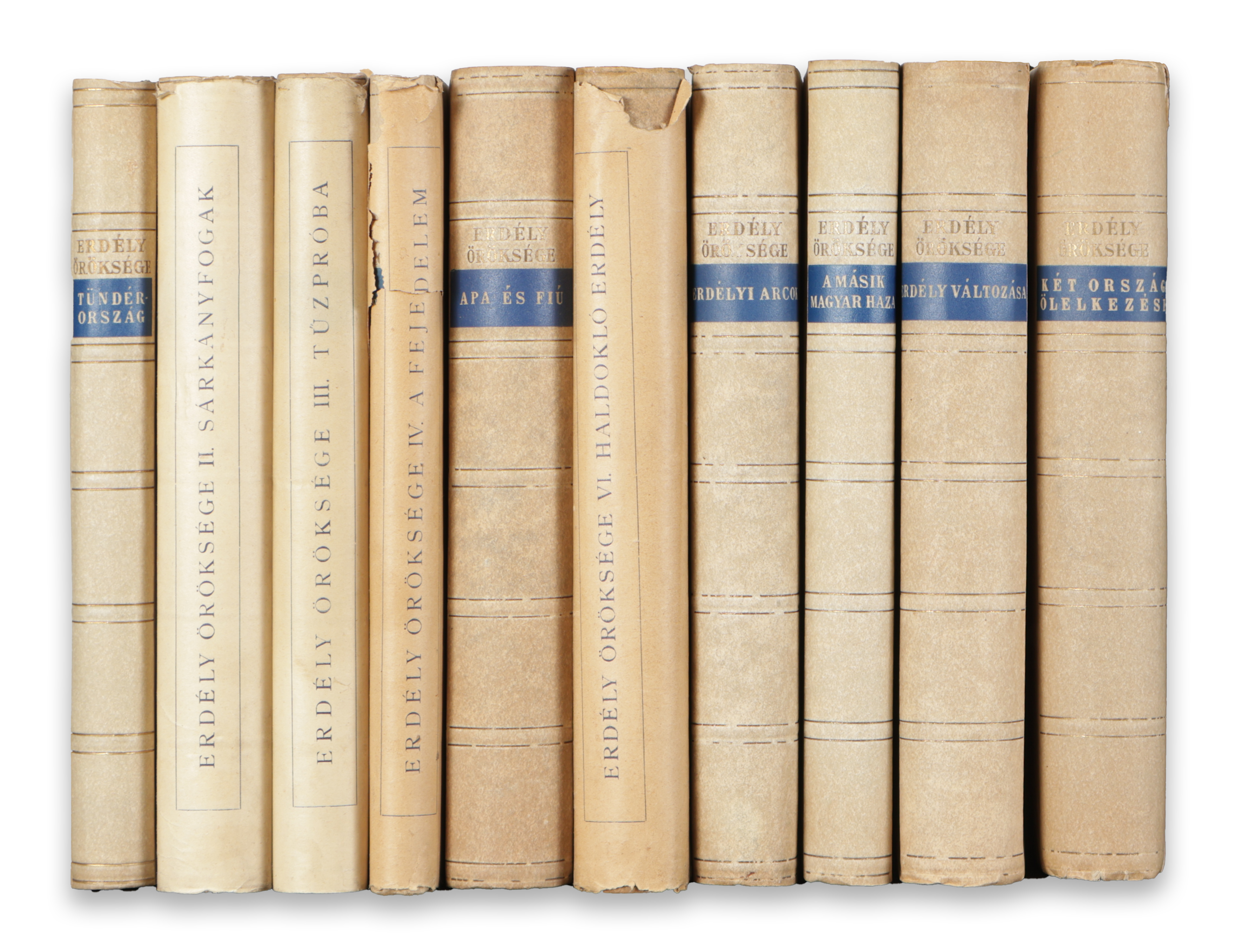 Kiadói, Erdély aranyozott címerével díszített kartonkötésben, megkímélt állapotban. A 2-3-4-6. kötetek eredeti papírborítóval, a többi selyempapírral védve. Becses forráskiadvány.