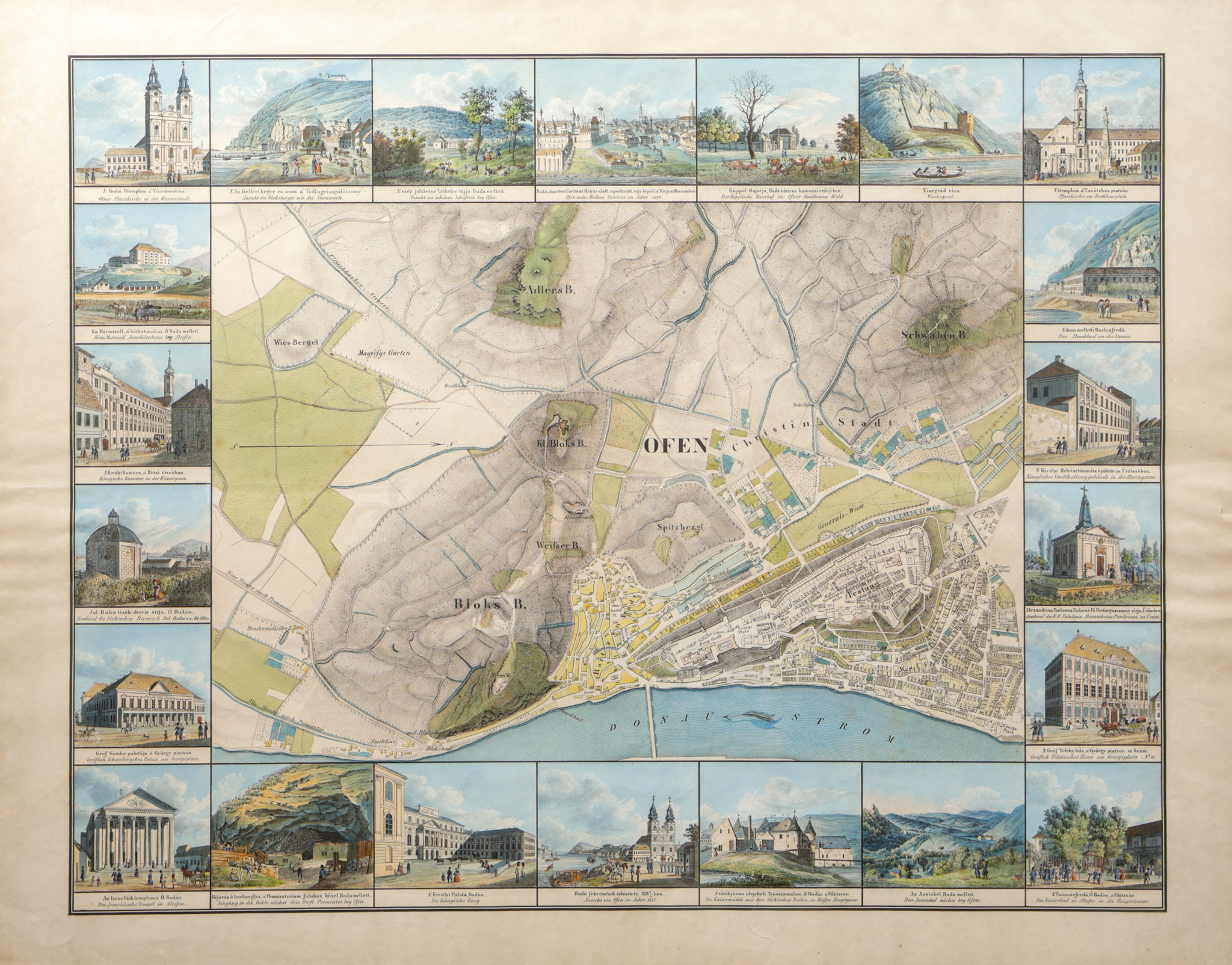 Vasquez díszalbumának négy nagyméretű, kézzel színezett, kőnyomatos térképlapjából a második, Buda városának látképe. Franz Weiss bécsi művész tollal készült litográfiája. A térkép mérete a képekkel együtt 56×71 cm.
