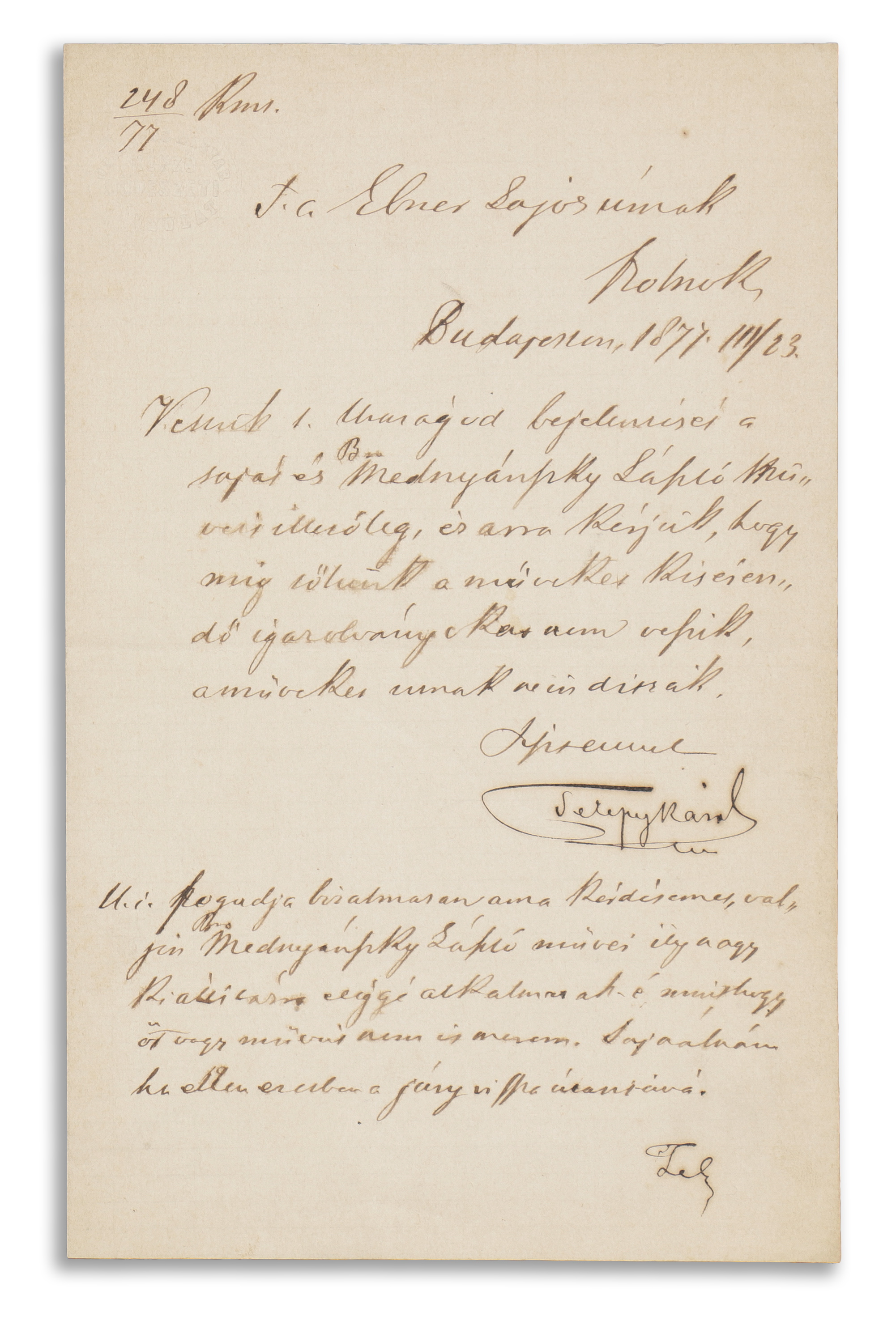 A Budapesten 1877. március 23-án kelt levelében Telepy Károly (1828–1906) festőművész kiállításra szánt festményei iránt érdeklődik: „Vettük t. Uraságod bejelentését a saját és Báró Mednyánszky László műveit illetőleg, és arra kérjük, hogy amig tőlünk a műveket kisérendő igazolványokat nem veszik, a műveket utnak ne indítsák.” Telepy hozzáteszi:„Fogadja bizalmasan kérdésemet, valjon Báró Mednyánszky László művei ily nagy kiállításra eléggé alkalmasak-é minthogy őt vagy műveit nem ismerem. Sajnálnám ha ellen esetben a jury visszautasítaná.”