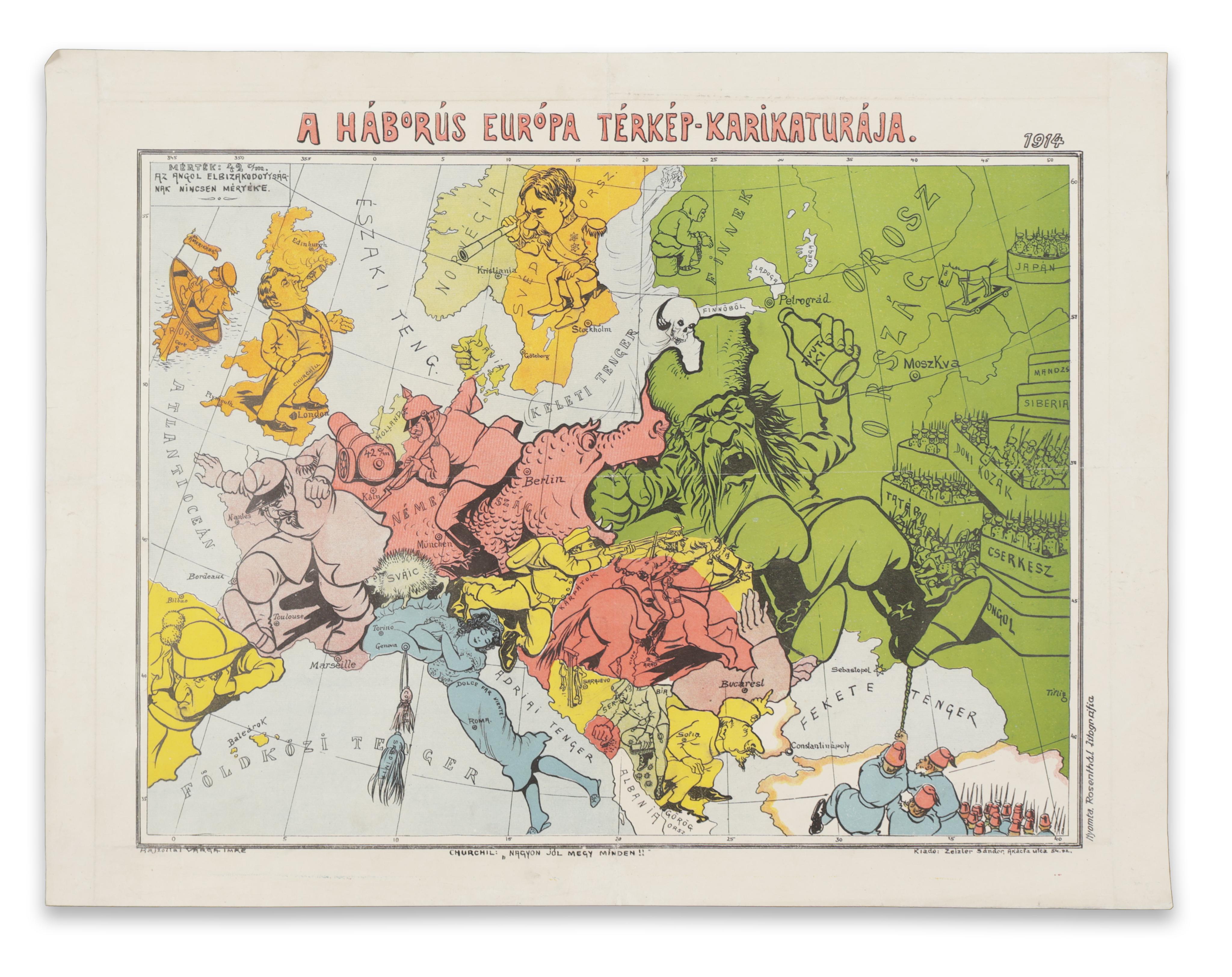 Varga Imre által készített színes kőnyomatú Európa-térkép, amely az I. világháborúban részt vevő feleket karikírozza. A rajzoló a budapesti élclapok foglalkoztatott grafikusa volt, és a háborús propaganda szinte minden praktikáját bevetette, így például a nemzeti jellemvonások és az ezekhez kapcsolódó előítéletek kifigurázását, egyszerűsítését. Nagy-Britanniát Churchill, Írországot és egy Amerika felé hajózó matróz, Svájcot egy tüskéit kimeresztő sün, Svédországot V. Gusztáv király, Olaszországot pedig egy fekvő nőalak "Dolce far niente!" felirattal személyesíti meg. A többi országot a rájuk jellemző fegyvernem képviseli (Magyarországot egy huszár). Mérete: 340 x 460 (420 x 545) mm. Paszpartuban.