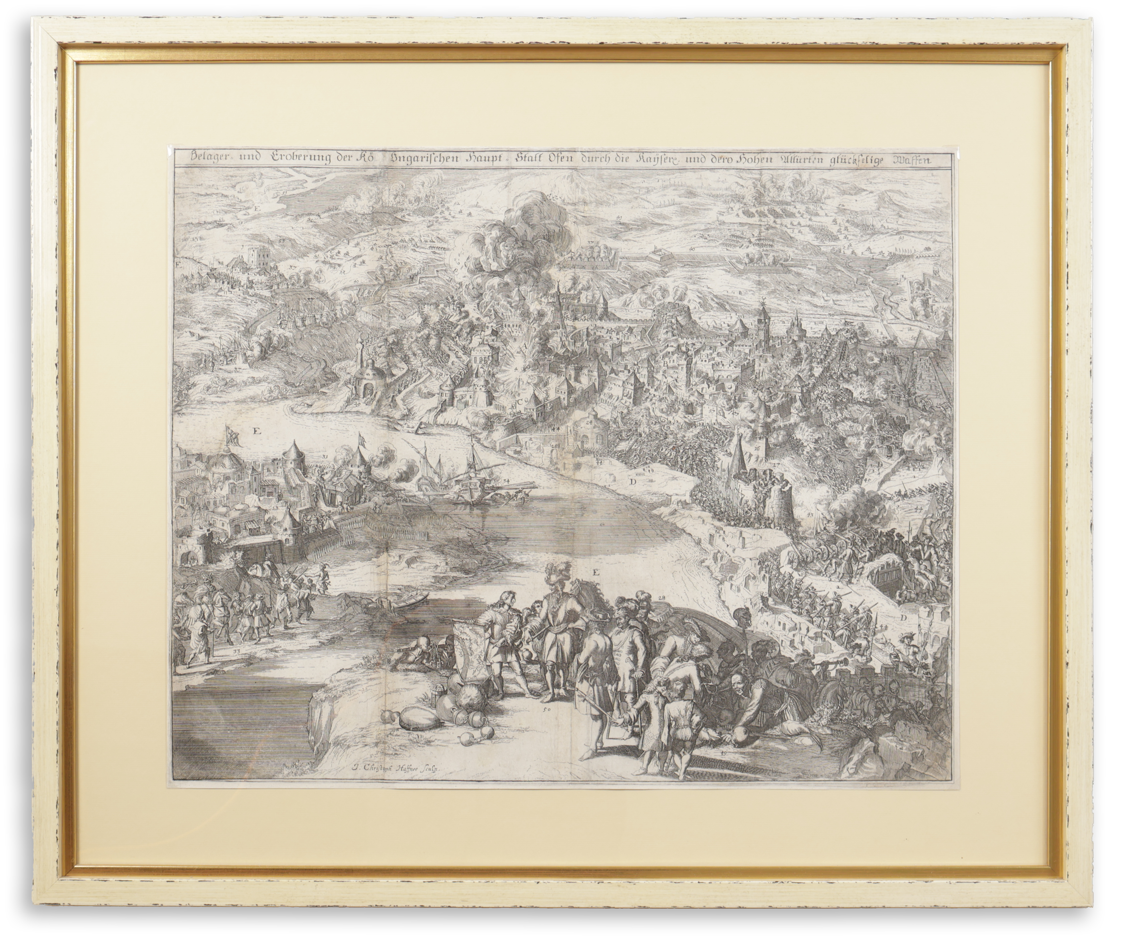 Siege of Buda. Etching: 55 × 44 cm. The view depicts the battle for control of the city between the Ottoman Turks and the Holy League. The buildings and events highlighted are indicated by letters and numbers. The recapture of Buda from the Turks took place after three months, on 2 September 1686. To the left is the city of Pest, in the foreground (Óbuda) is one of the chief commanders, Prince Charles V of Lorraine and his staff. On the Danube, a cannonade, Prince Elector Miksa, is camped on Gellért Hill.