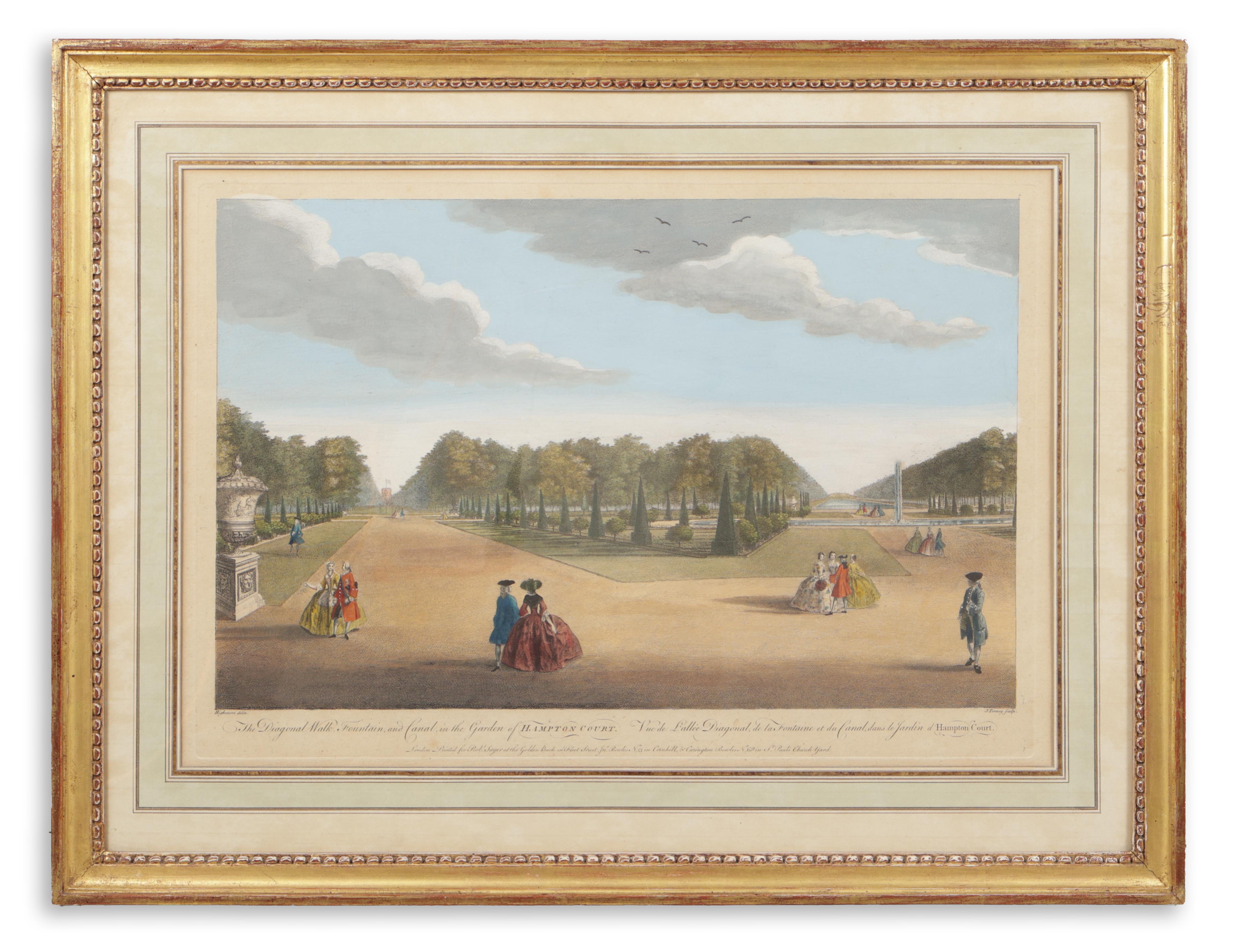Kézzel színezett rézmetszet Anthony Highmore rajza alapján. Metszette John Tinney (c. 1706 - 1761) angol metsző 1744-ben (első kiadás) vagy 1766-ban (második kiadás). A látkép a londoni Hampton Court királyi palota kertjét mutatja a szökőkúttal és csatornával.