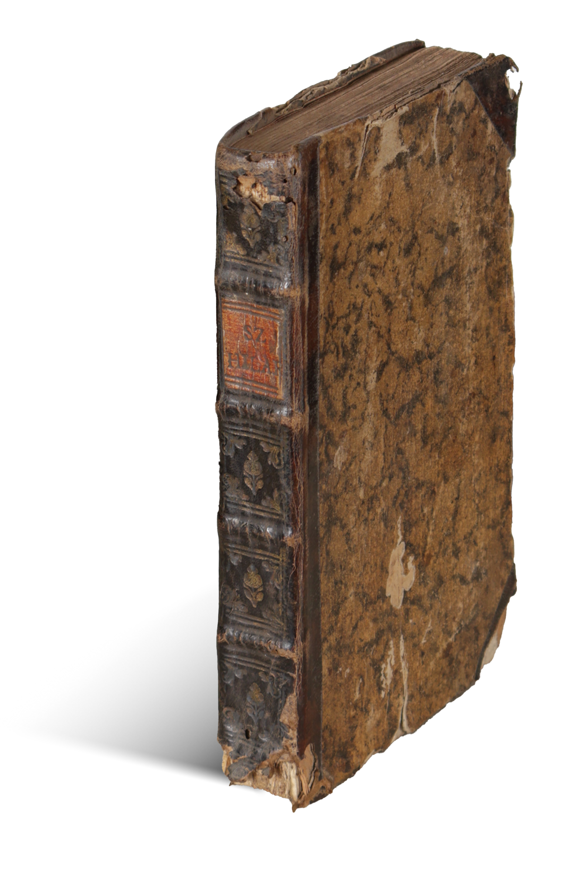 Contemporary, worn half leather binding with raised band and faded gilt ornaments. Red title vignette to spine. Cover is damaged, minor loss at corners, loss to spine edges. Internally a nice, clean copy.