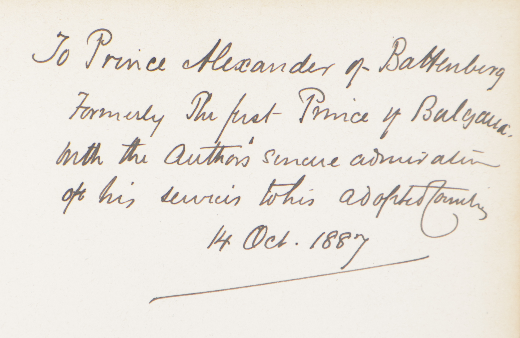 Az első előzéken kivételes dedikáció: „ To Prince Alexander Battenberg formerly the first Prince of Bulgaria with the authors….14.oct.1887.”