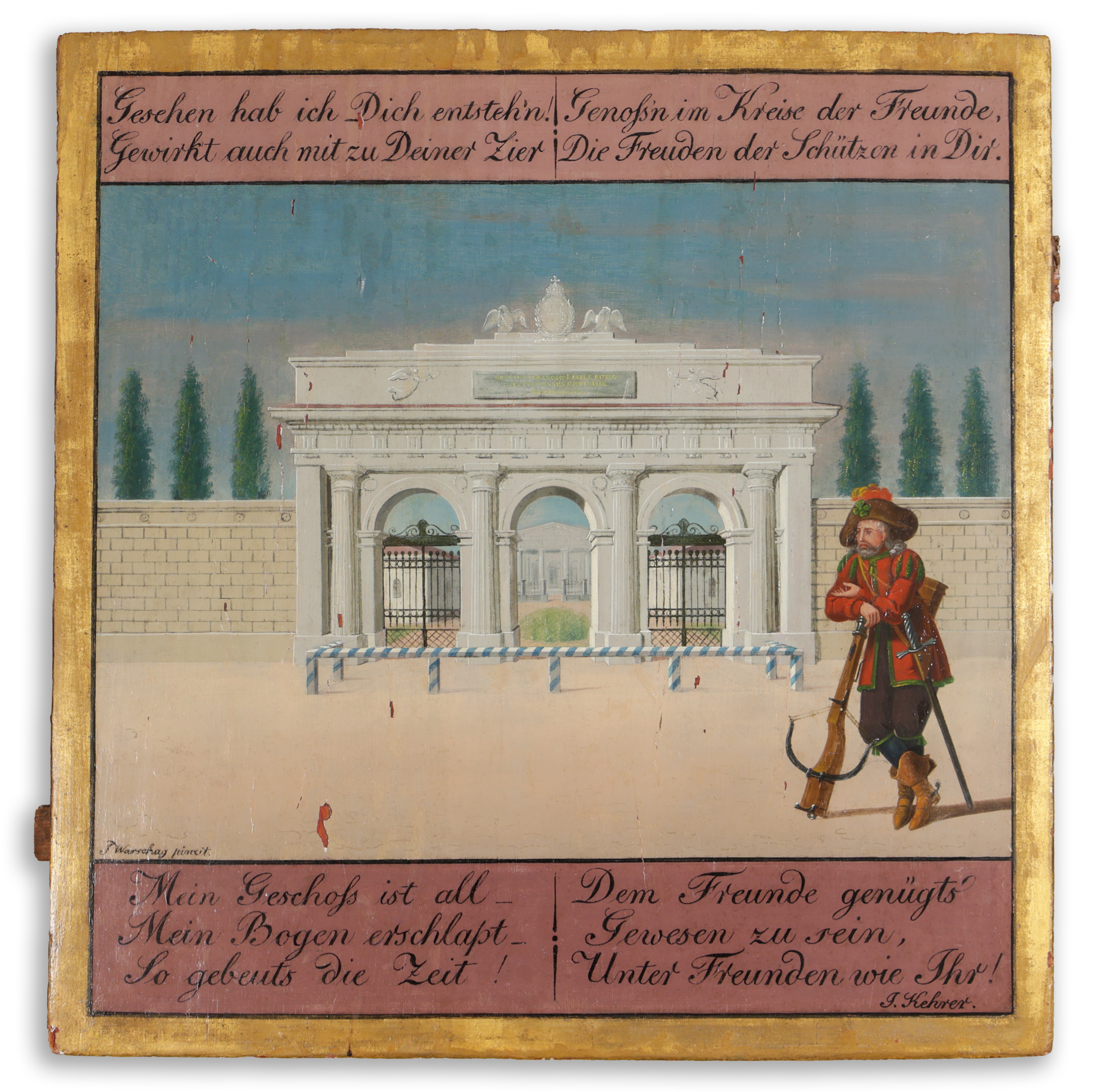 Olajfestmény fatáblán. Mérete 52×54×2,5 cm. Balra lent: J. Warshag pinxit. Jobbra J. Kehrer. Készült 1824-1838 között. A képet vastag aranykeretezés fogja körül. A képmezőn alul és felül négy ablakban német nyelvű versezet Josef Kehrertől, aki ismert pesti tímármester volt. A buzdító szöveg a bajtársiasságról, az összetartozásról szól. A klasszicista stílusú, impozáns kapuzat jobb oldalon álló, számszeríjára és kardjára támaszkodó elegáns úr bal kezével az épületre mutat: „Gerschen hab ich dich ensteh’n Gewirth auch mit zu deiner zier, Genof’s im kreise der freunde die freunden schützen in dir. Mein geschofs ist all mein bogen erschlapt so gebeuts die zeit- Dem freunde genügts gewesen zu rein unter freunden wie.” Láttalak felemelkedni, együtt növekedni velem, élvezd a baráti kört és védd a barátokat. Az íjam kimerült, ez az én történetem, elég időt töltöttem a hű barátok között. (nem szöveghű fordítás) A lőtábla restaurált, néhány apróbb lepattanással, fennmaradt kortársaival ellentétben gyönyörű állapotban. (Polgári Lőhely néven Vasquez 1837- es kőnyomatán és Lehnhardt Sámuel 1824-es rézmetszetén is ez az épület látható.)