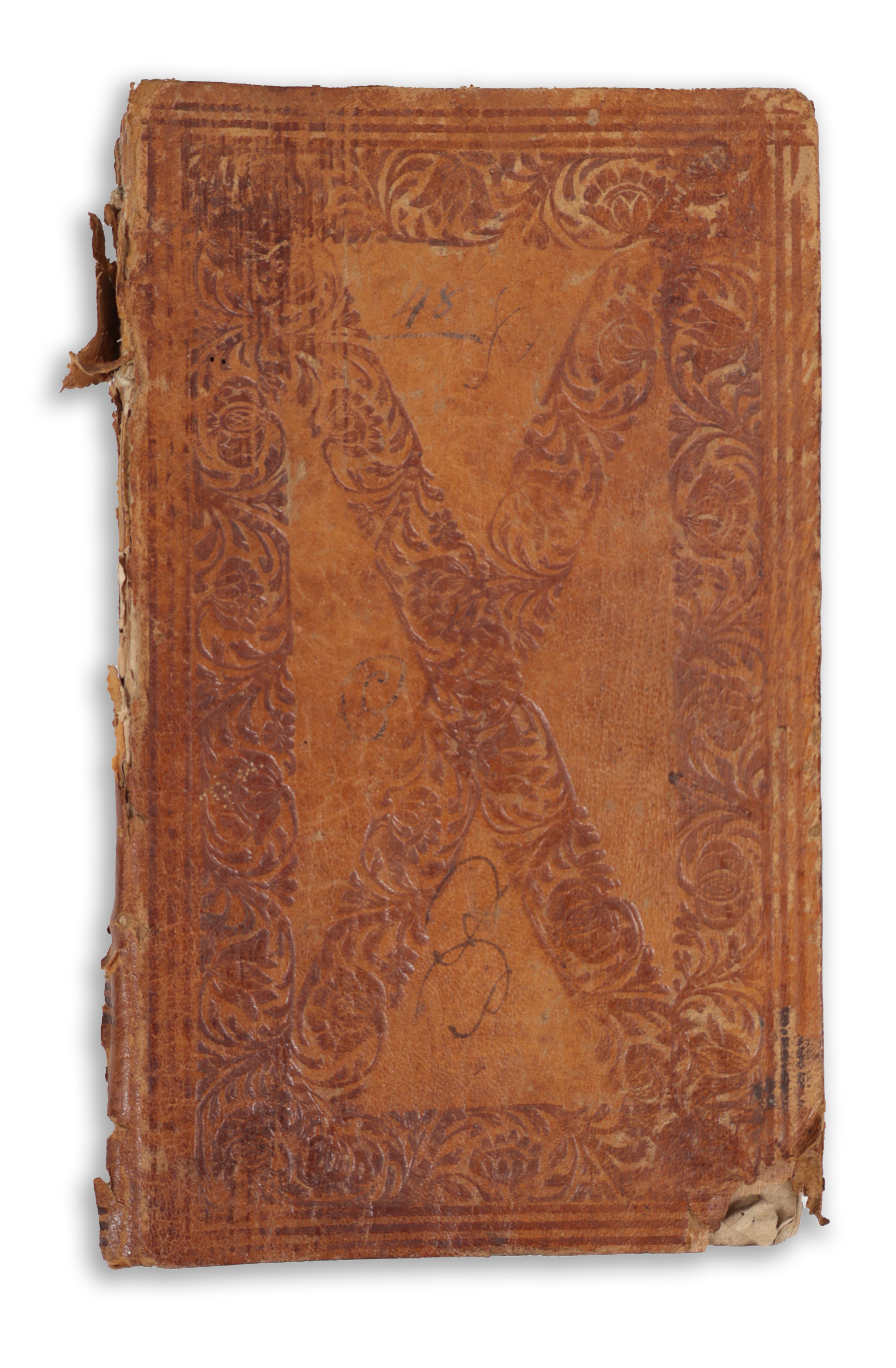 In a contemporary blind-stamped full leather binding. Spine damaged, missing, front board corner also damaged. Minor stains and losses on title page and first two leaves.
