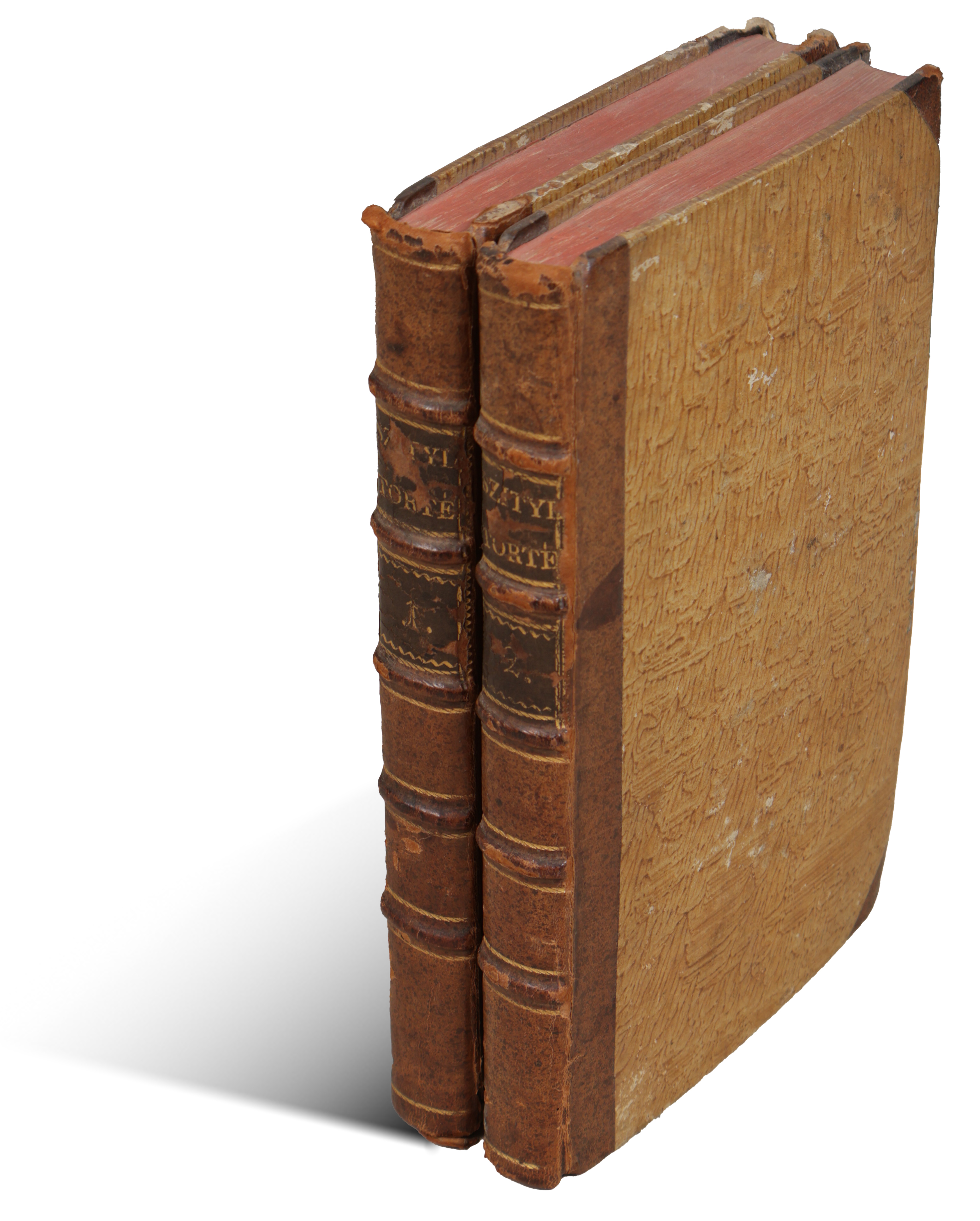 Korabeli, bordázott, aranyozott gerincű félbőr-kötésben, körül piros lapélekkel.