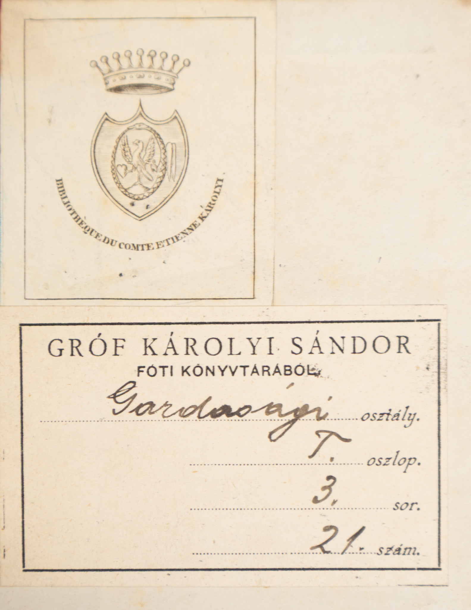 Az elülső borító rectoján Comte Etienne [István] Károlyi ex librise és Gróf Károlyi Sándor fóti könyvárának possessori címkéje. A gazdag könyvtárral rendelkező Károlyi István (1797–1881) főispán, politikus, akadémikus és mecénás a francia értelmiség köreiben, sőt XVIII. Lajos és X. Károly király udvarában is szívesen látott vendég volt.