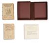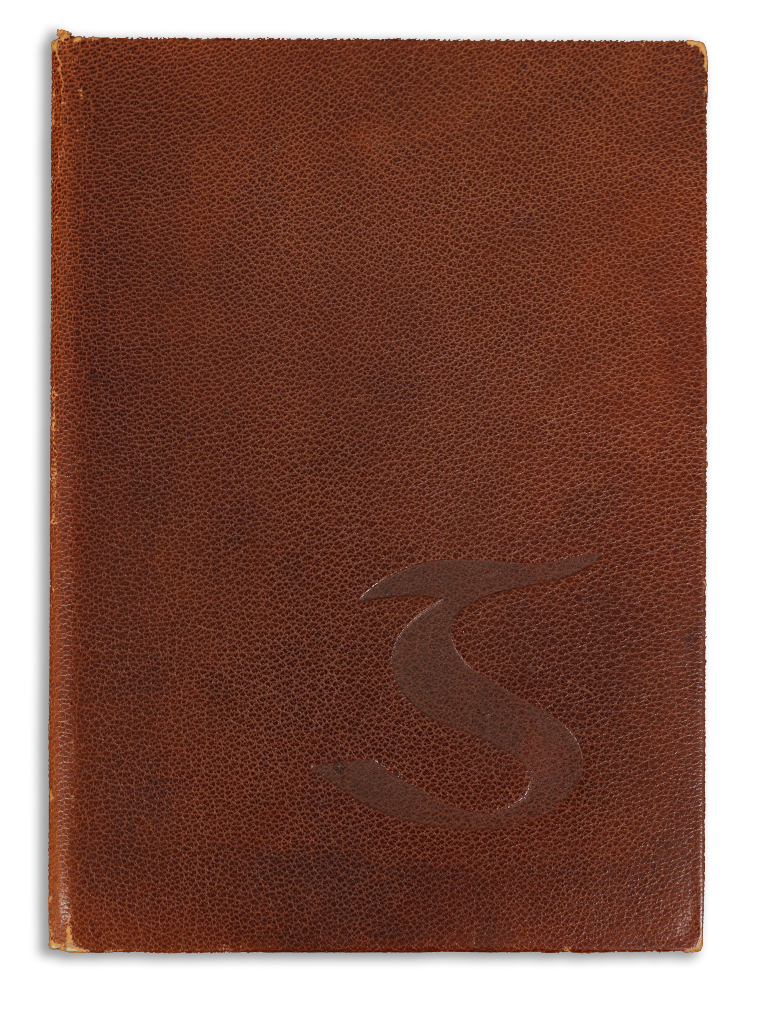 Unbound, in cardboard folder and leather box. Repair on the title.