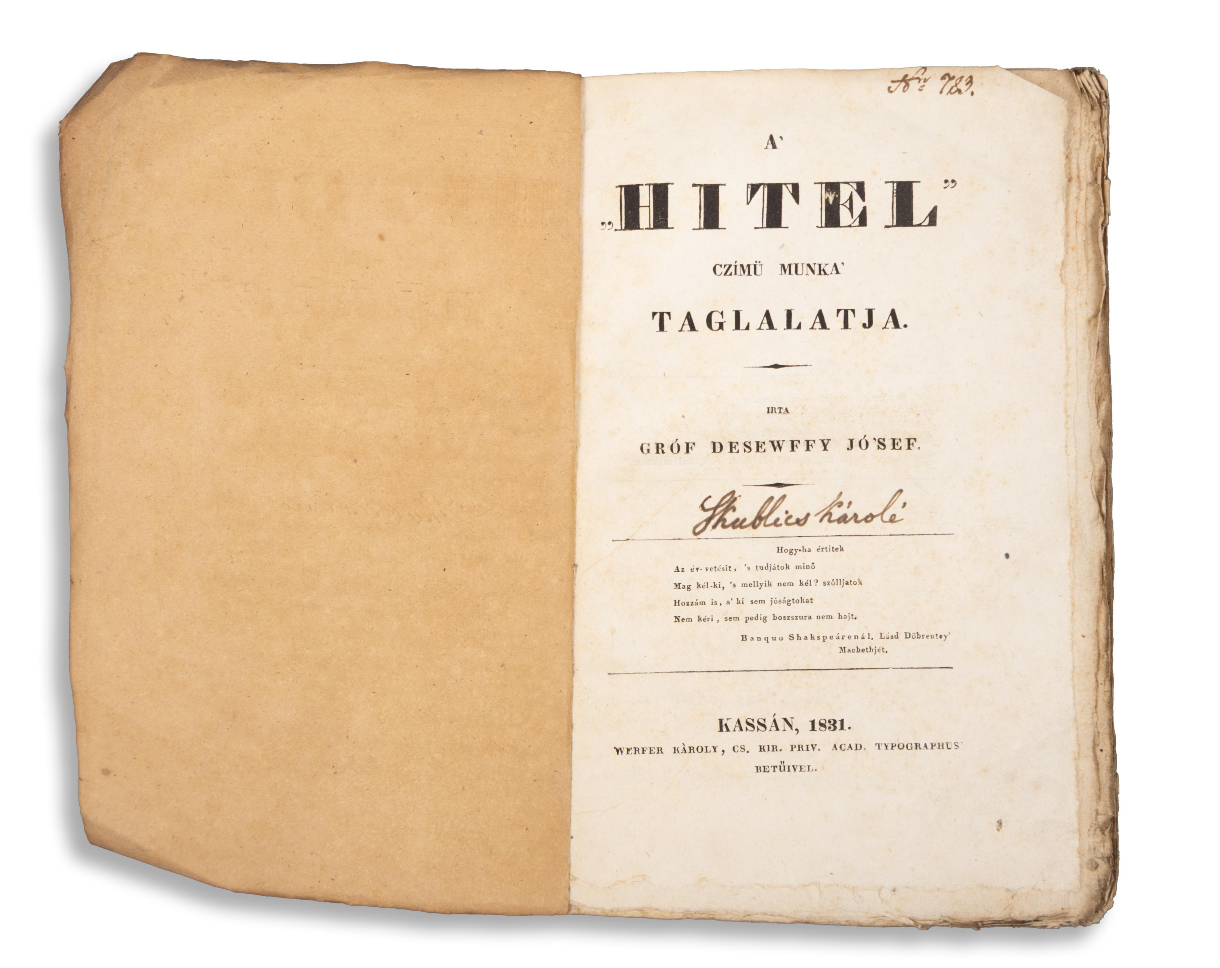 A címlapon Skublics Károly (1779–1853) zalaszentbalázsi földbirtokos, táblabíró, könyvtáralapító (?) possessori bejegyzése.