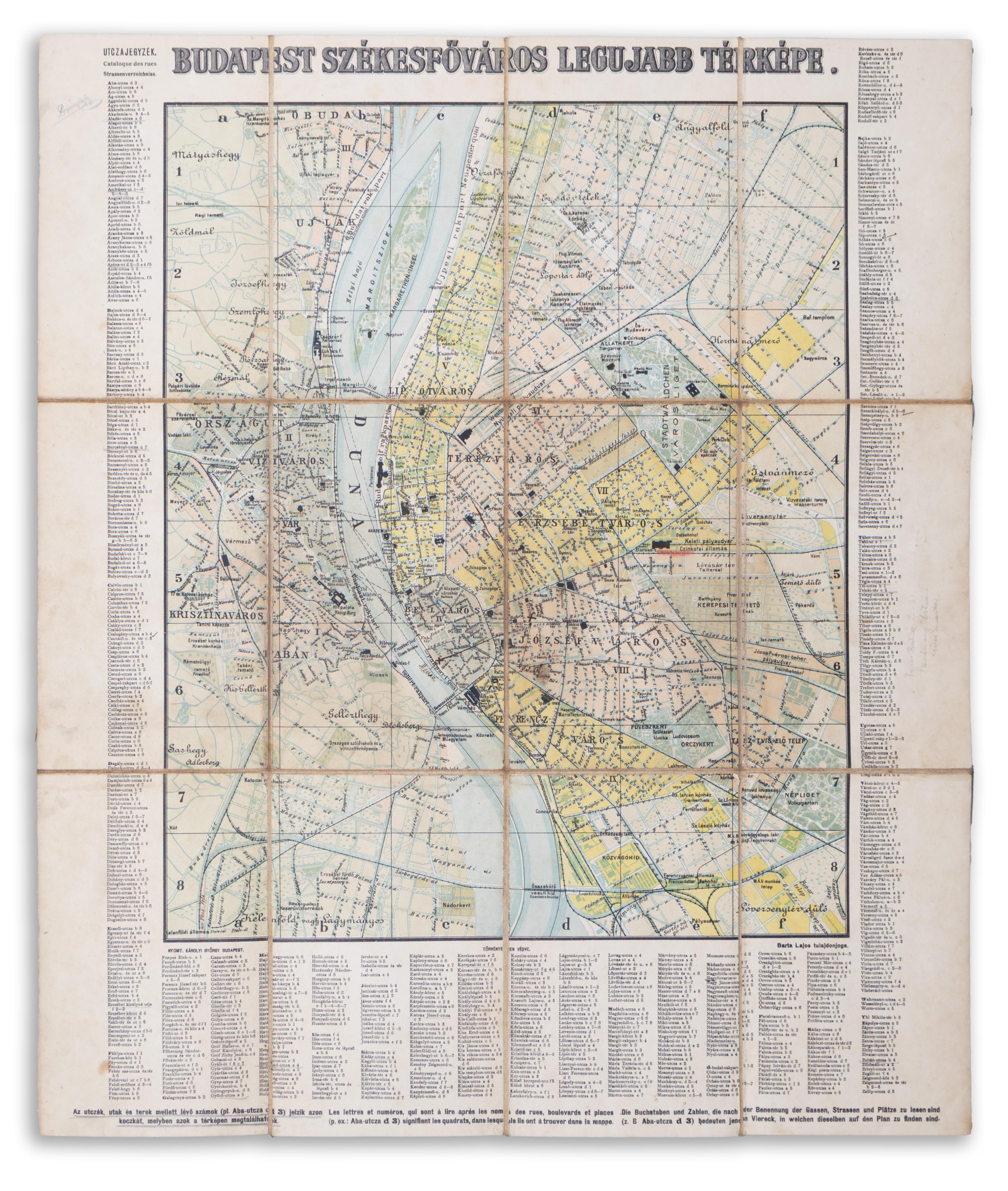 A háromnyelvű (magyar, francia, német) térkép bal sarkánál: "Nyomt. Károlyi György Budapest", jobb sarkánál: „Barta Lajos tulajdonjoga” felirattal. A térkép körül betűrendes utcajegyzék.