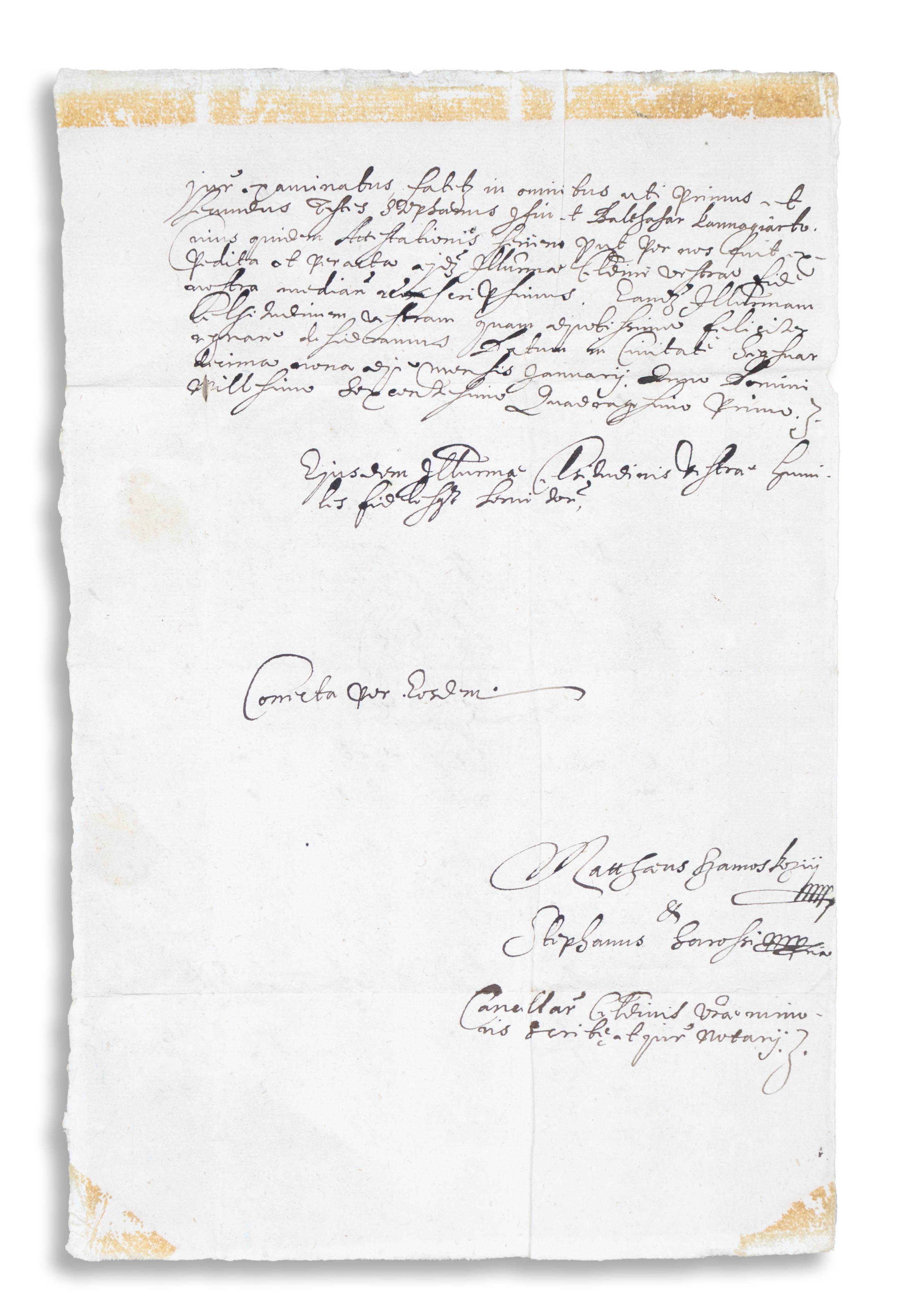 Papír, latin nyelven, a tanúvallomás magyarul. 1 fol., két beírt oldal, hozzá boríték, a külzeten címzés és két rányomott felzetes gyűrűspecsét.