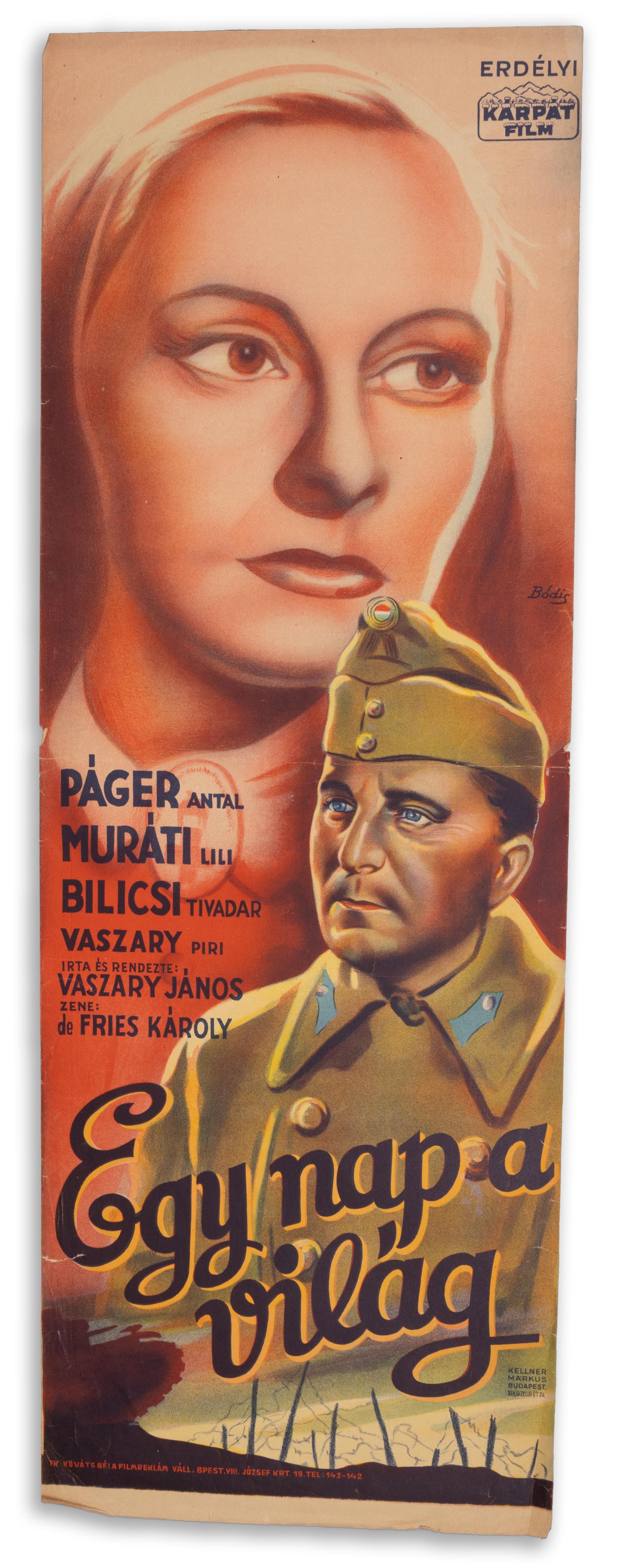 A világháborús időszak legendás melodrámáját hirdető rácsplakát. Írta és rendezte: Vaszary János. Operatőr: Hegyi Barnabás. Zene: De Fries Károly. Szereplők: Páger Antal, Muráti Lili, Bilicsi Tivadar. A film bemutatója 1944. február 24-én volt, az Uránia Filmszínházban. A Csak egy nap a világ című, bús, szerelmes dal a kor hangulatát kifejező sláger lett.