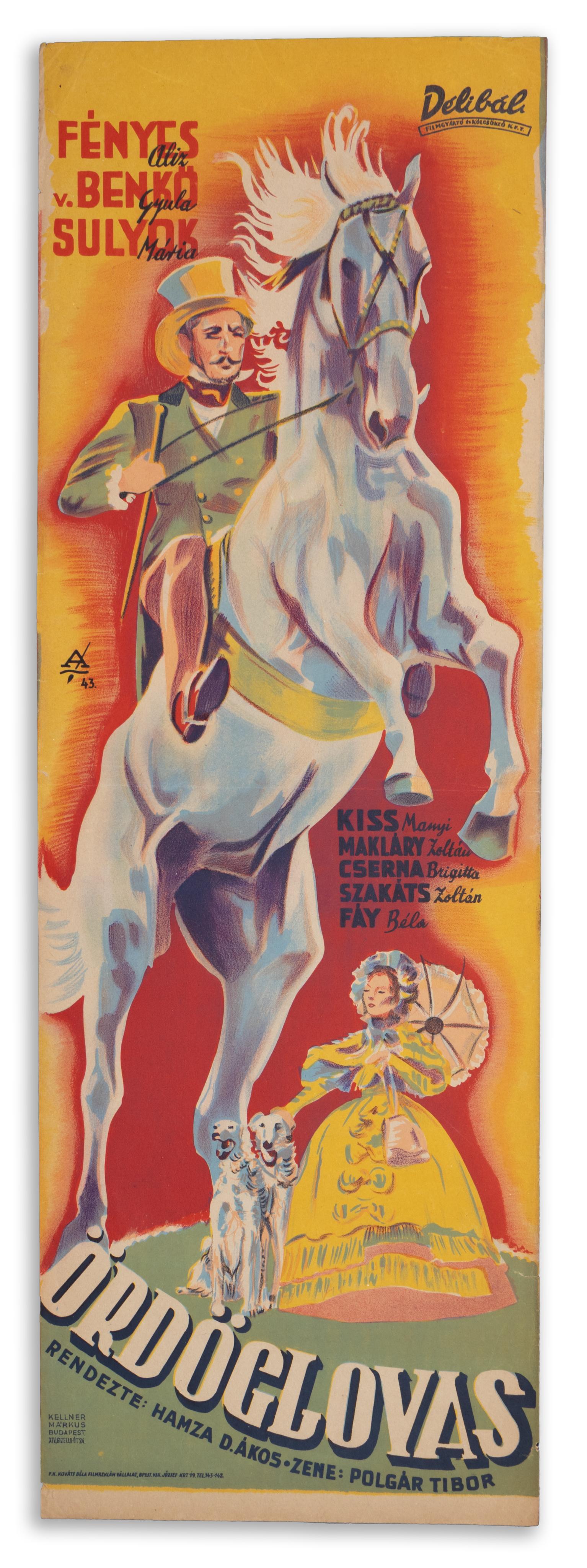 Az 1942. november 30-án bemutatott Ördöglovas című kalandfilm rácsplakátja. Rendező: Hamza D. Ákos. Író: Asztalos Miklós. Zene: Polgár Tibor. Szereplők: Fényes Alice, Benkő Gyula, Sulyok Mária, Kiss Manyi, Makláry Zoltán, Cserna Brigitta, Szakáts Zoltán, Fáy Béla.