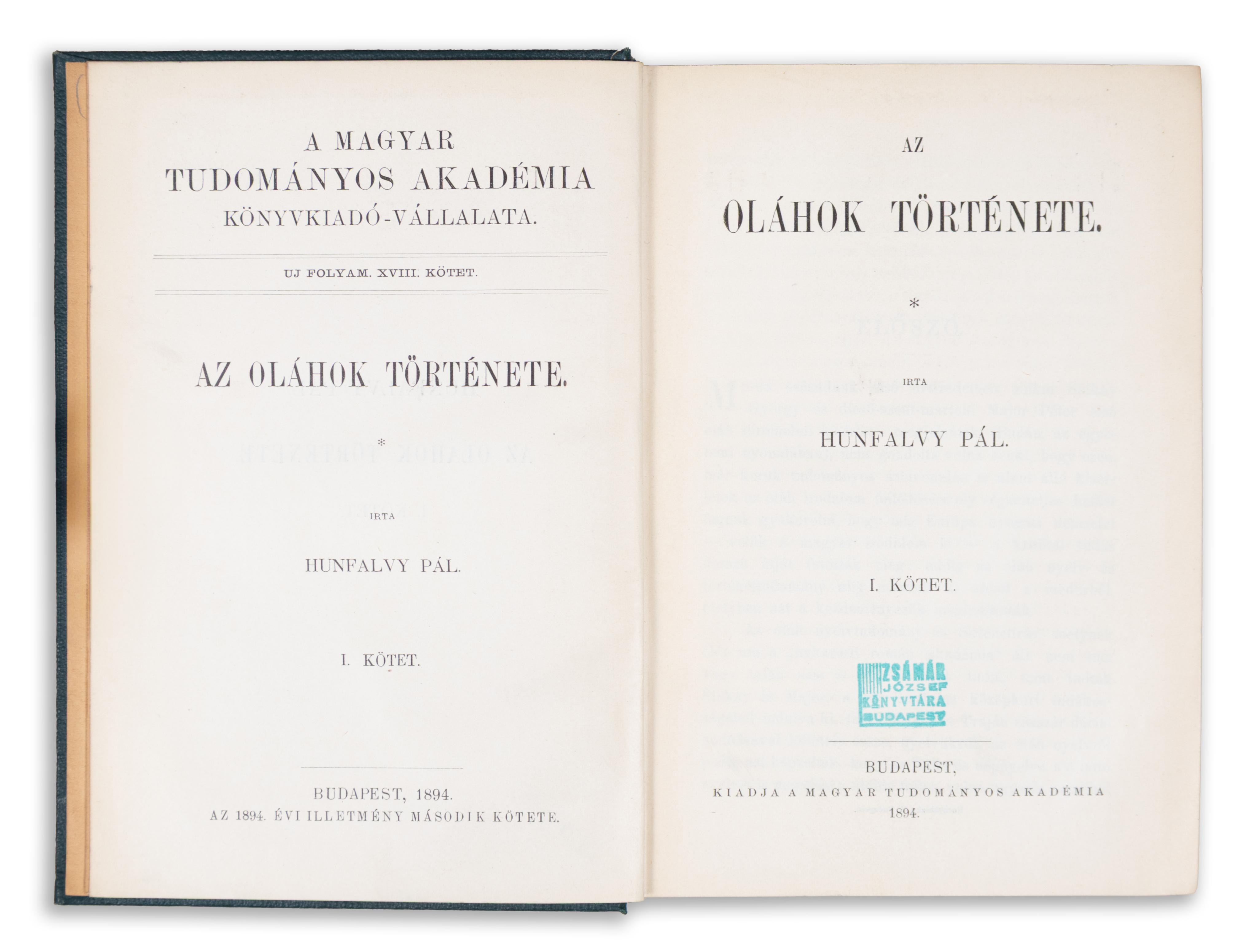 Hunfalvy Pál : Az oláhok története. I-II. kötet.