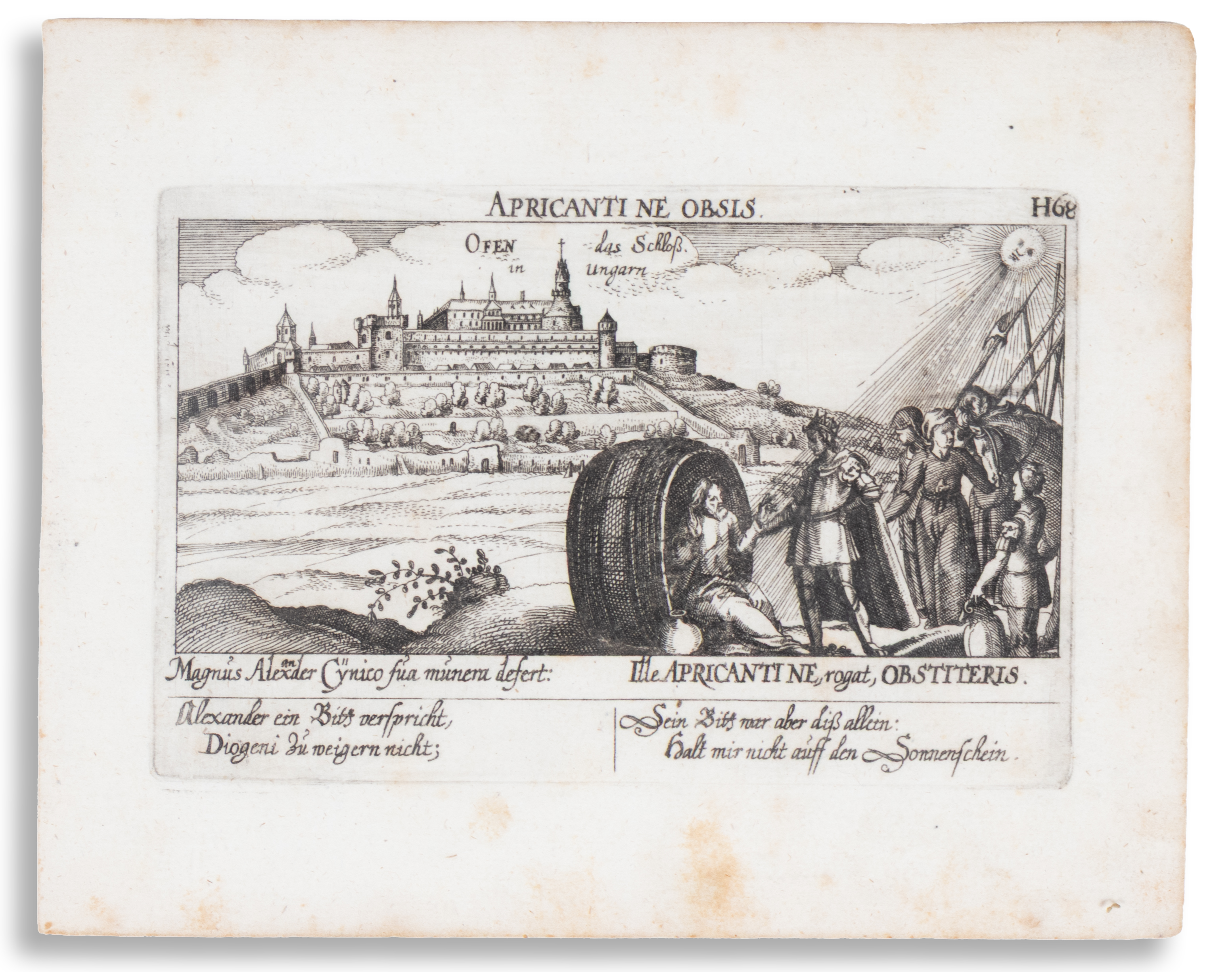 Title at the top center of the illustration. Above the veduta the inscription ‘Apriccanti ne obsis.’ Beneath the view of the fortress, in the foreground, Diogenes and Alexander the Great are depicted. The scene and the Latin-German text beneath it recall the moment when once at Craneion, Alexander the Great offered the philosopher basking in sunlight to ask for whatever he wished. The Cynic Diogenes asked for only one thing: 'Do not block the sun from me!'