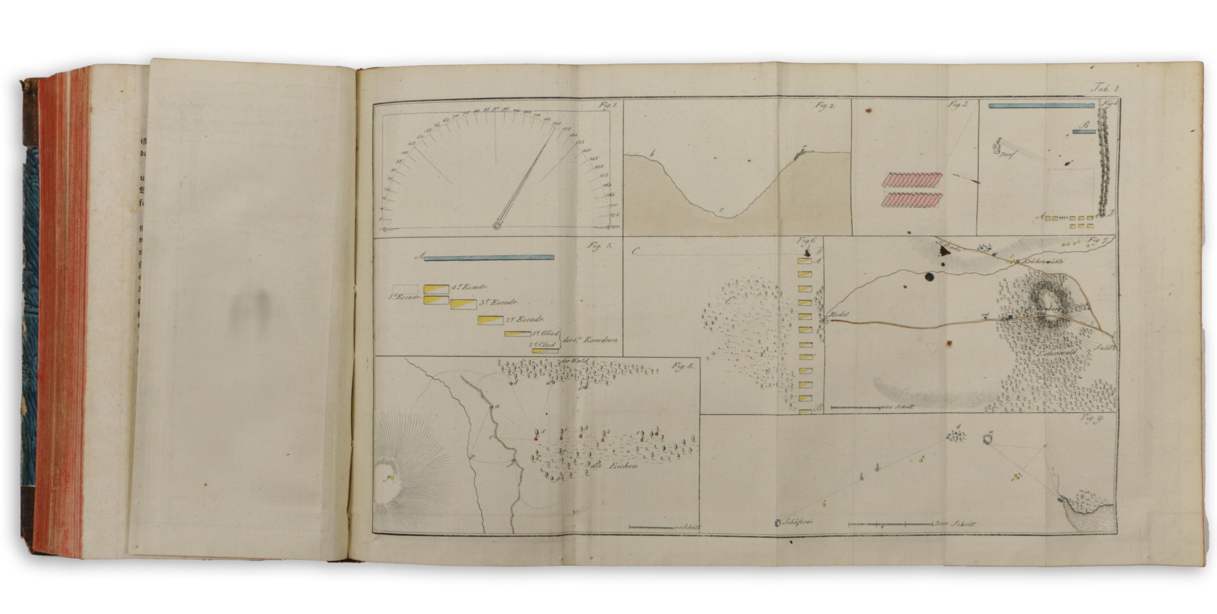 Large folded engravings show plans, maps, and battle positions, some hand-coloured.