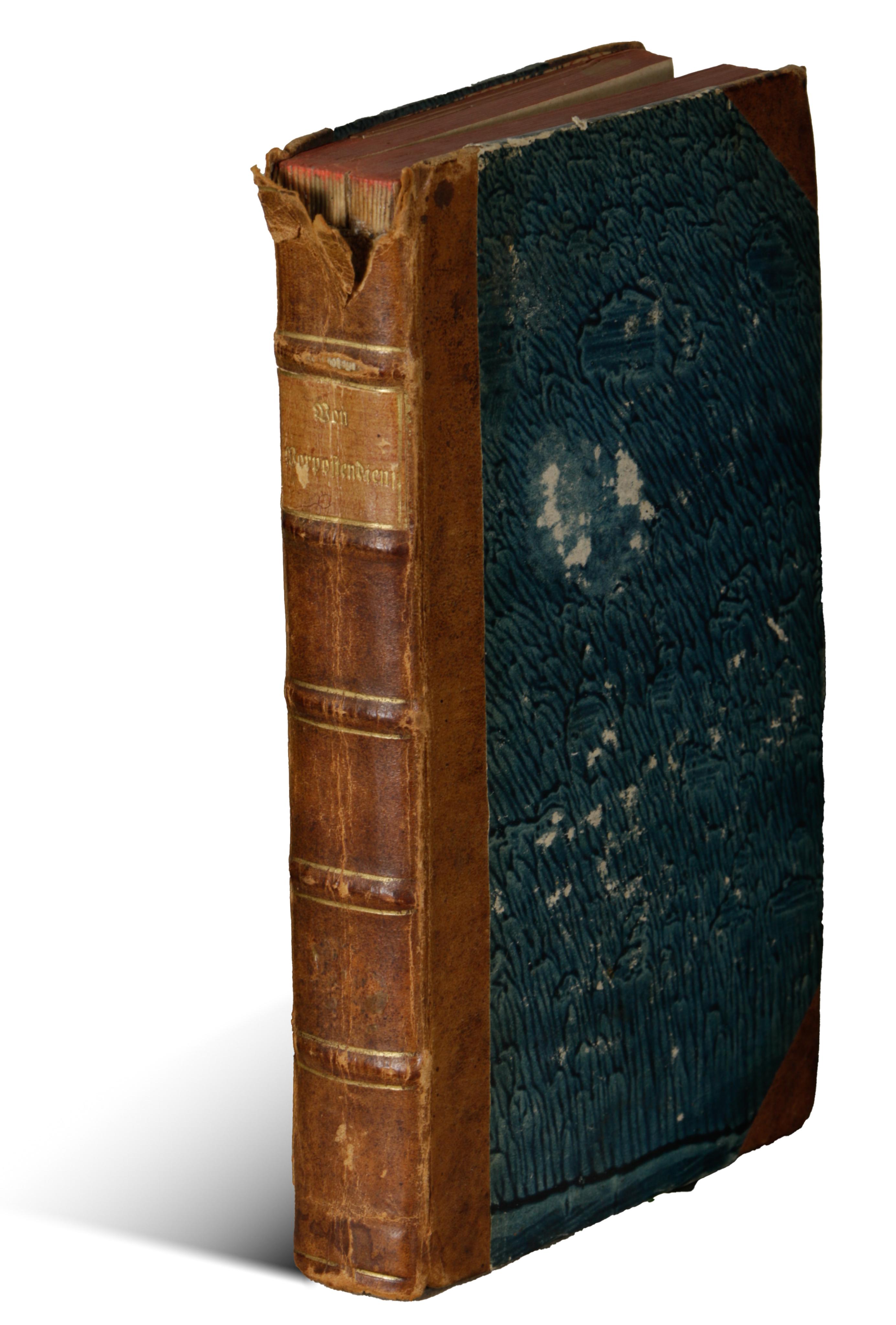 Korabeli félbőr kötésben, bordázott és aranyozott gerinc, címkével, körül festett lapszélekkel. A gerinc felső sarka sérült, egyébként tiszta és szép példány.